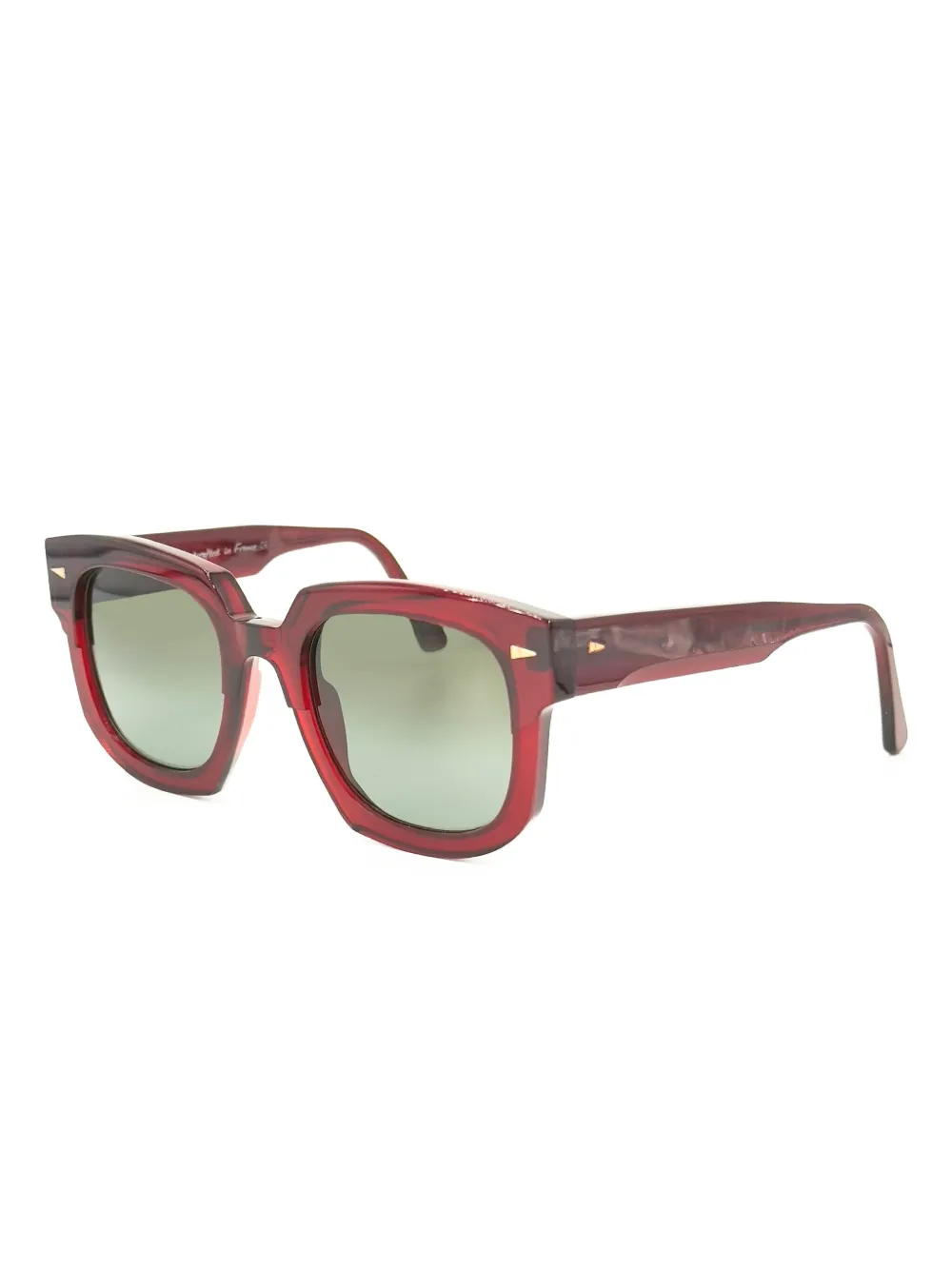 rood vierkant montuur groen getinte glazen goudkleurige details dikke pootjes