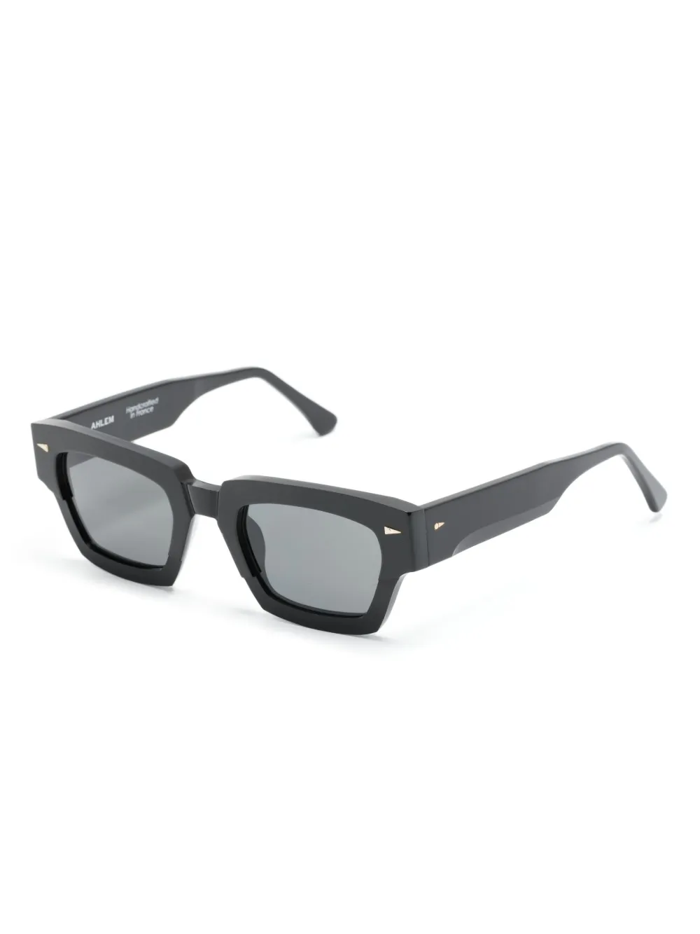 Zwart, acetaat, grijze glazen, rechthoekig montuur, geschulpte pootjes en gebogen uiteinde. Deze bril wordt verkocht met een beschermhoes..