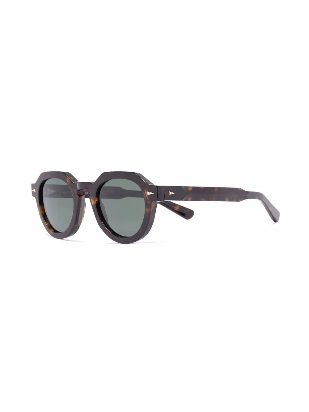 Tortoise effect, rond montuur en groengetinte glazen. Deze bril wordt verkocht met een beschermhoes.