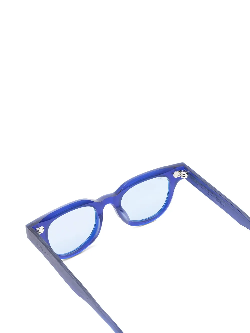 blauw vierkant montuur lichtblauwe glazen details metalen ringlets Deze bril wordt verkocht met een beschermhoes.