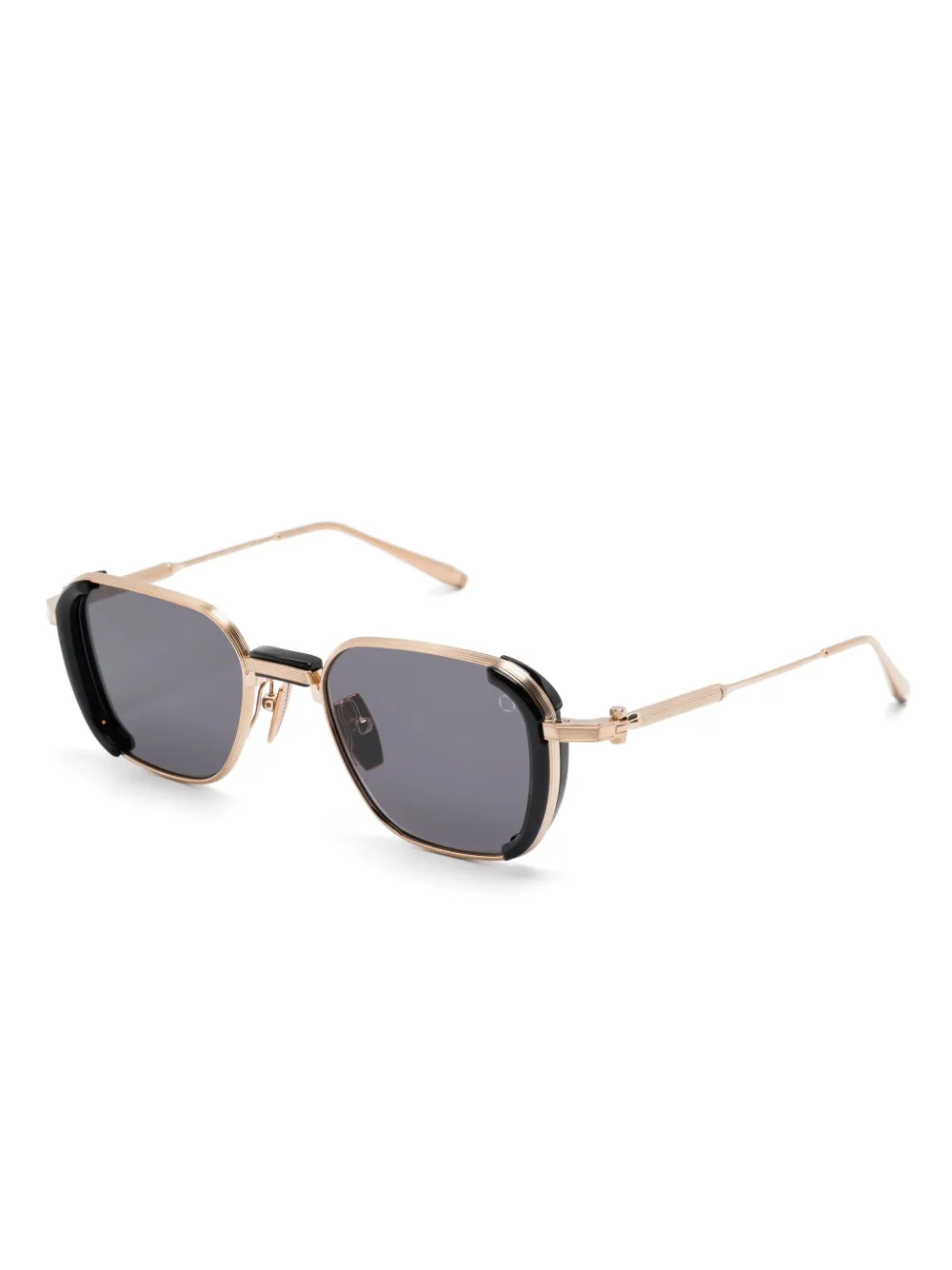 goudkleurig vierkant montuur grijze glazen neuskussentjes gewelfde pootjes gebogen uiteinden Deze bril wordt verkocht met een beschermhoes.