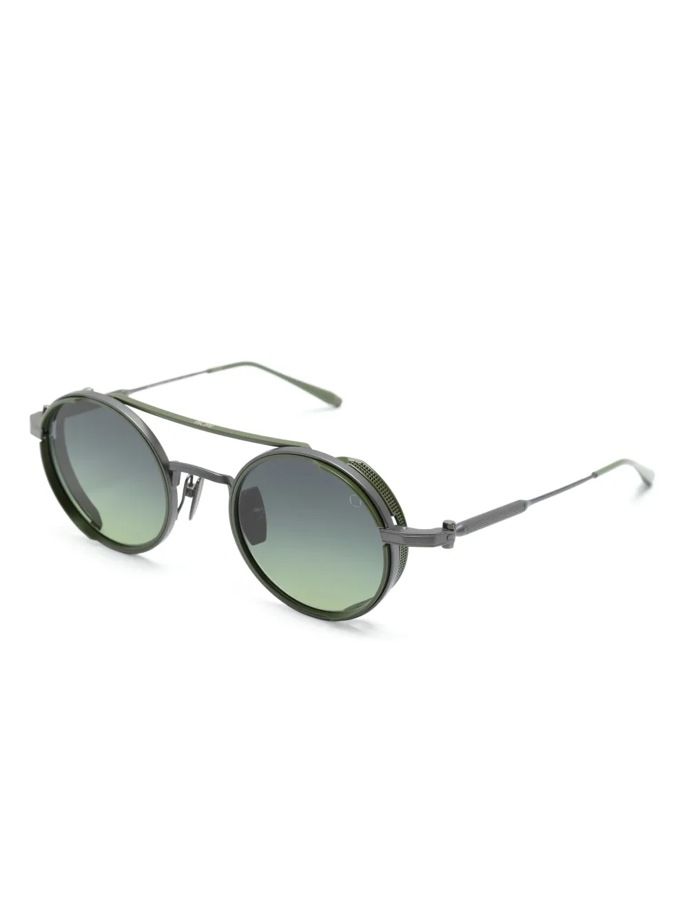 zilverkleurig gewelfde pootjes gebogen uiteinden titanium rond montuur olijfgroen glazen met kleurverloop neuskussentjes dubbele neusbrug Deze bril wordt verkocht met een beschermhoes.