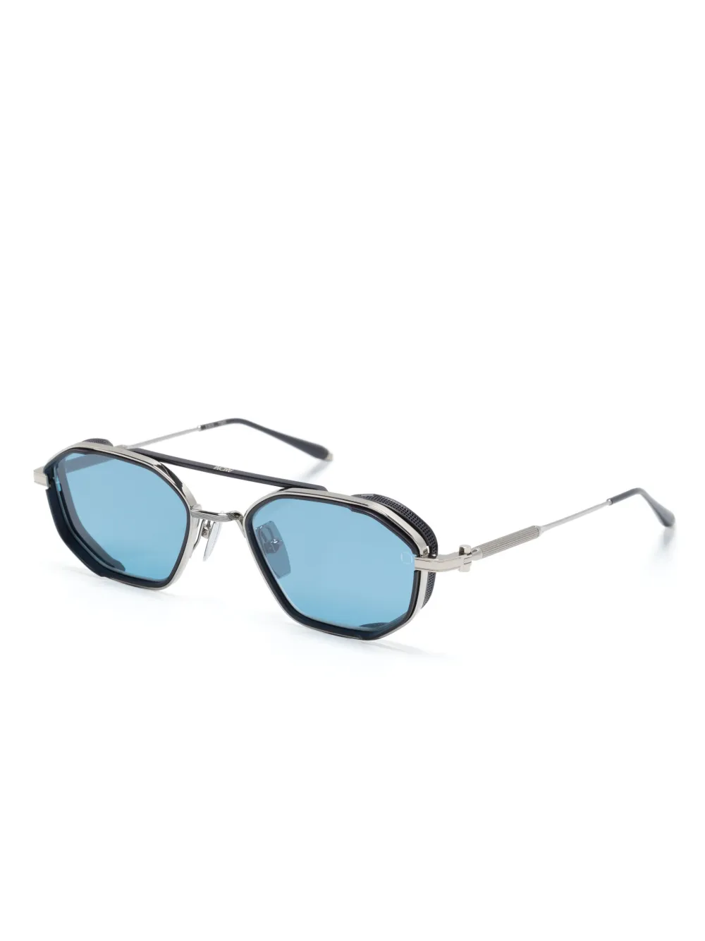 zilverkleurig/marineblauw titanium geometrisch montuur blauwe glazen neuskussentjes bewerkte pootjes en gewelfde uiteinden Deze bril wordt verkocht met een beschermhoes.