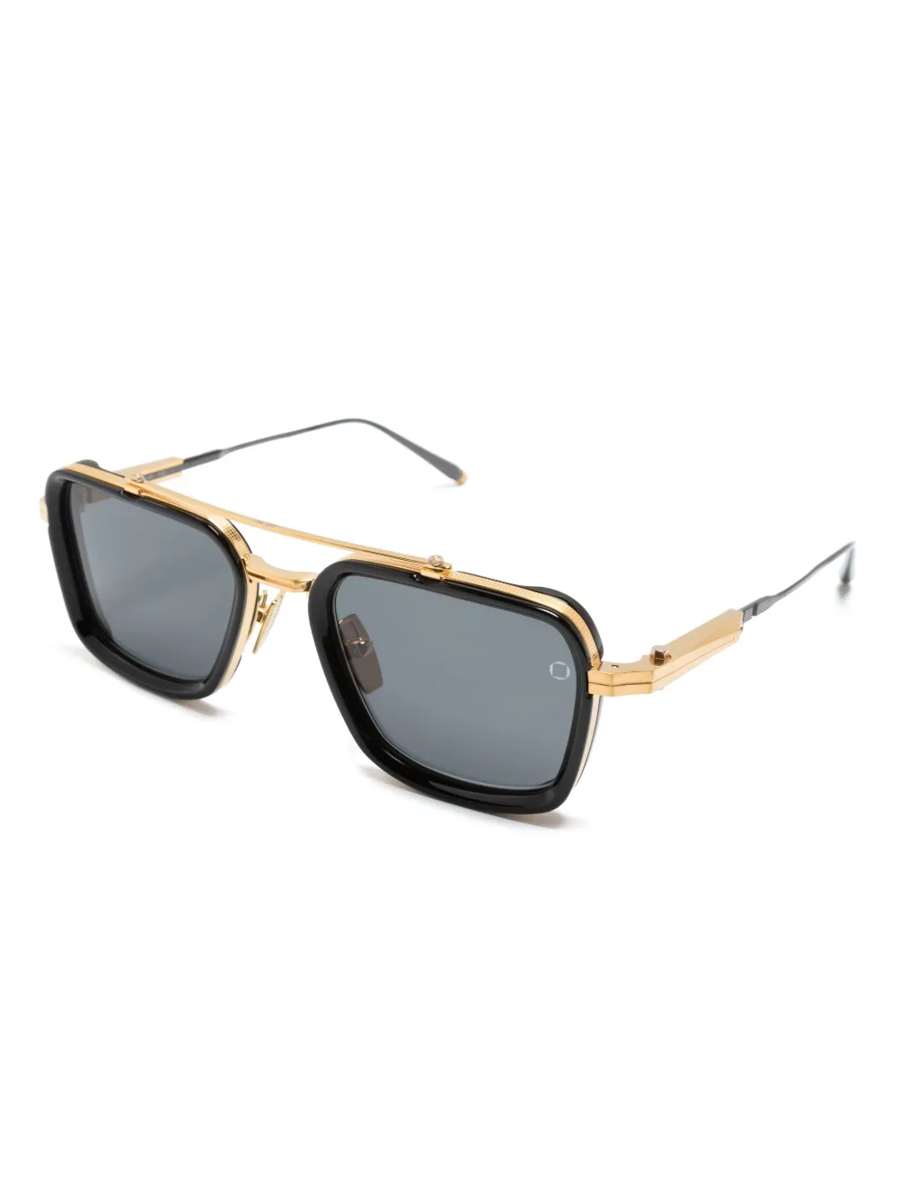 Zwart, titanium, acetaat, gekleurde glazen, rechthoekig montuur, verhoogde neusbrug, goudkleurig materiaal, neuskussentjes, rechte pootjes en gebogen uiteinde. Deze bril wordt verkocht met een beschermhoes..