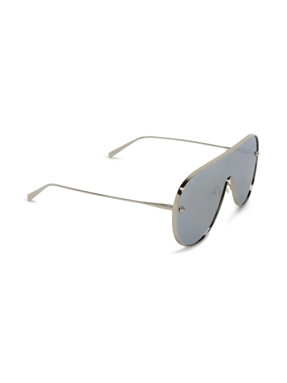 zilverkleurig metaal oversized montuur gespiegelde glazen neuskussentjes rechte pootjes gebogen uiteinden Deze bril wordt verkocht met een beschermhoes.