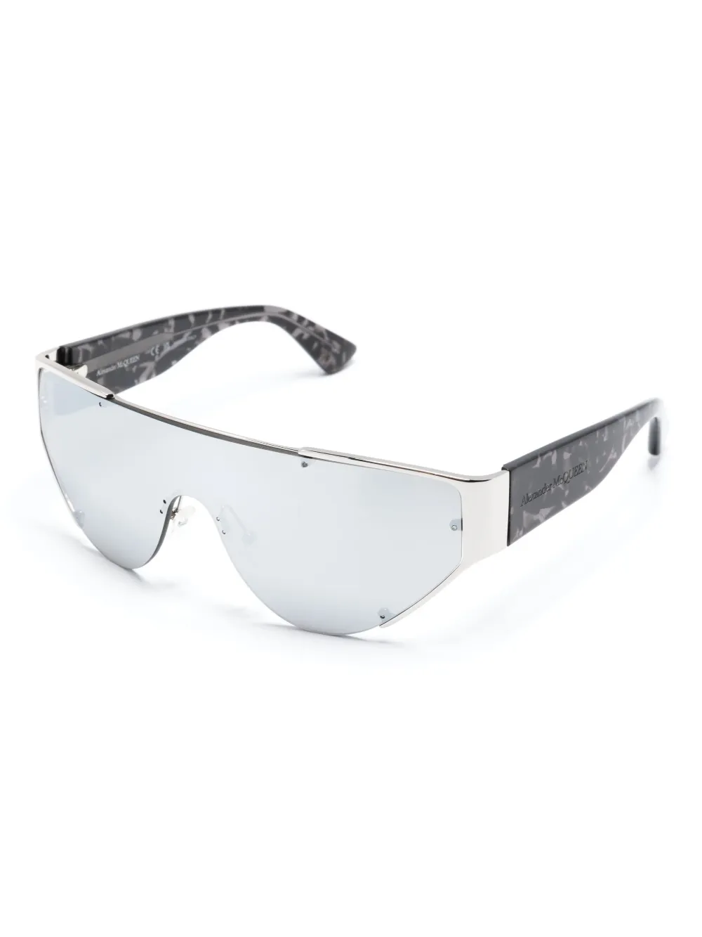 zilverkleurig/zwart acetaat shield montuur gespiegelde glazen neuskussentjes schildpadschild-effect en gegraveerd logo op de pootjes rechte pootjes gebogen uiteinden Deze bril wordt verkocht met een beschermhoes.