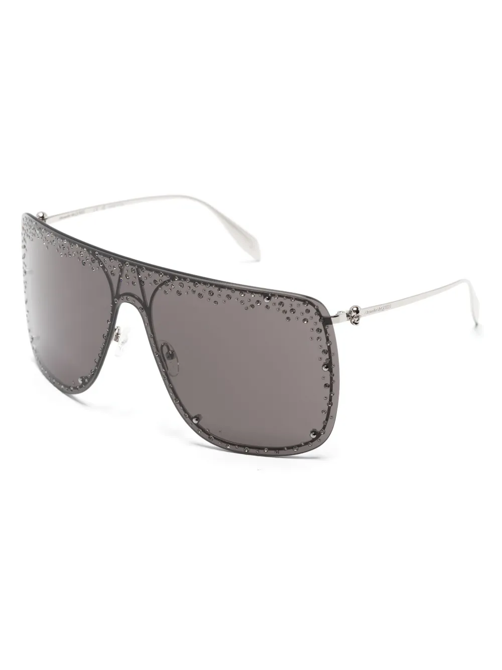 Zilverkleurig, metaal, oversized montuur, shield montuur, grijze glazen, verfraaid met bergkristallen, neuskussentjes, doodskoppatch, pootje met gegraveerd logo, rechte pootjes en gebogen uiteinde. Deze bril wordt verkocht met een beschermhoes..