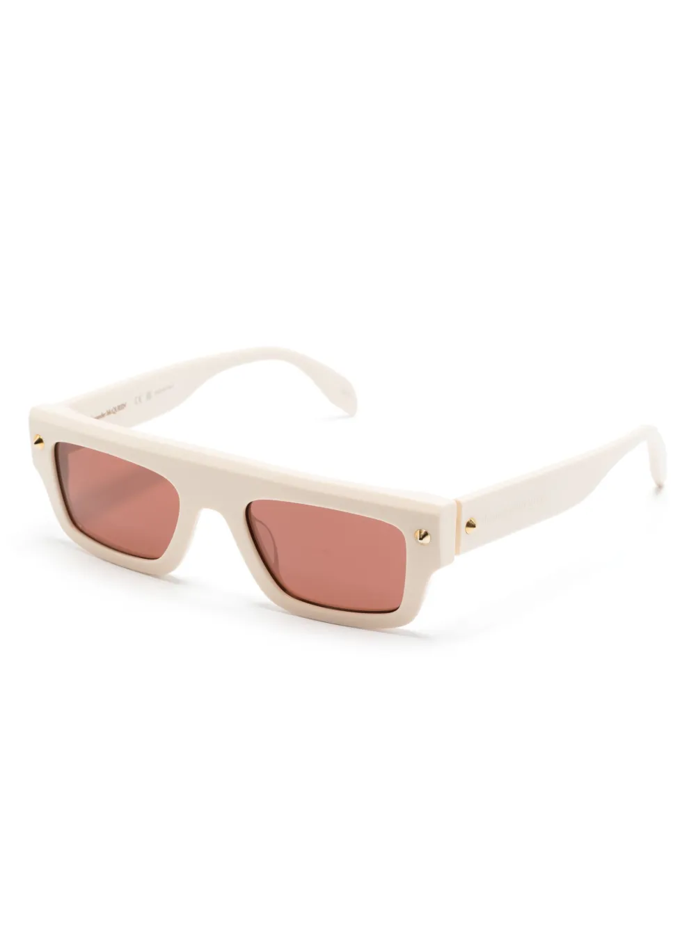 Crèmewit, vierkant montuur, gekleurde glazen, logoprint aan de zijkant, goudkleurig materiaal, rechte pootjes en gebogen uiteinde. Deze bril wordt verkocht met een beschermhoes..