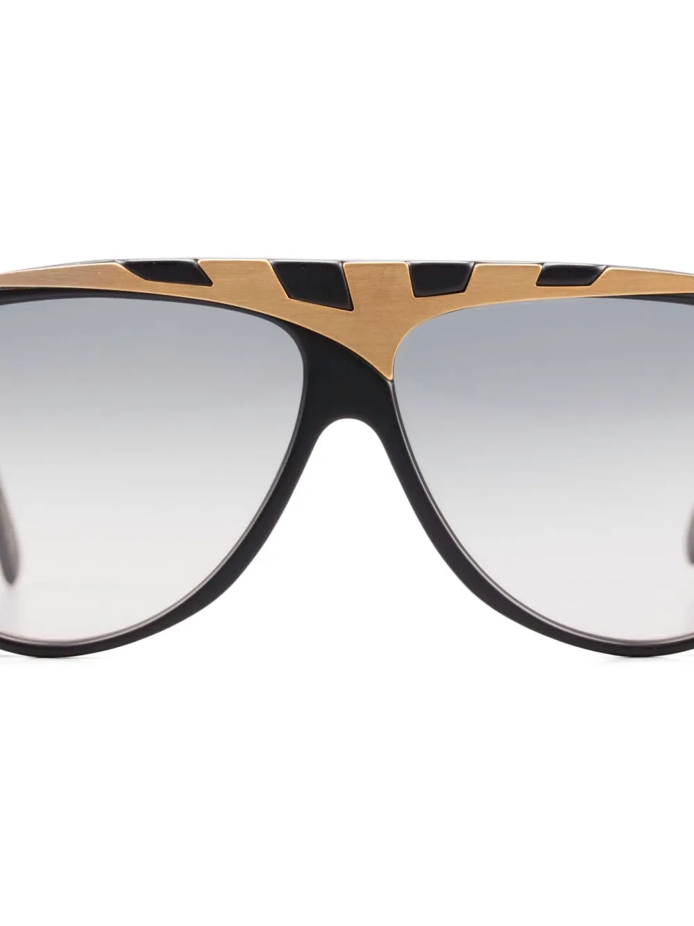 zwart/bruin geometrisch montuur goudkleurige details gekleurde glazen neuskussentjes glazen met kleurverloop Deze bril wordt verkocht met een beschermhoes.