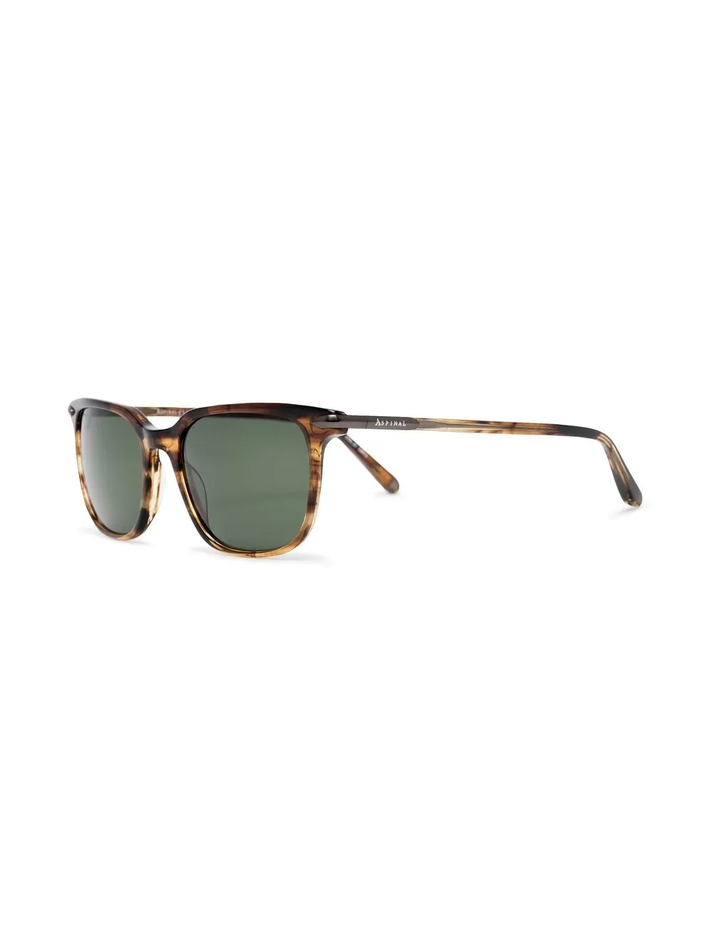 Acetaat, bruin, gekleurde glazen, tortoise effect en gebogen uiteinde. Deze bril wordt verkocht met een beschermhoes..