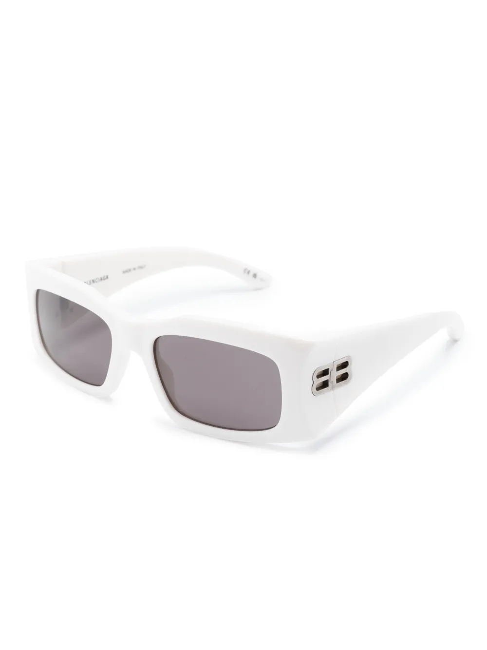 Wit, acetaat, rechthoekig montuur, gekleurde glazen, logoplakkaat op het pootje, rechte pootjes en gebogen uiteinde. Deze bril wordt verkocht met een beschermhoes..
