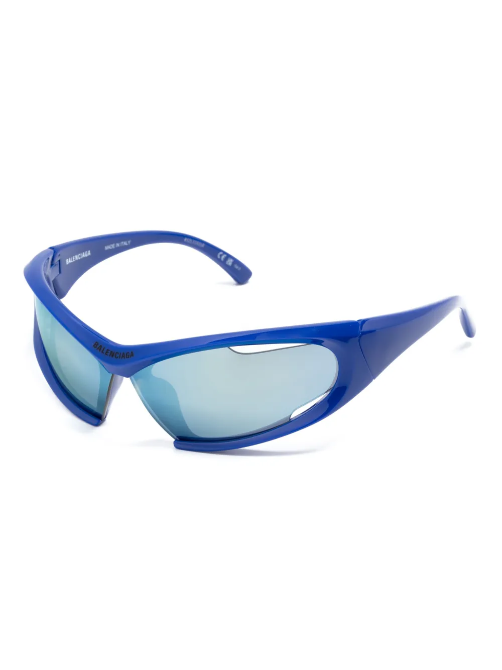 elektrisch blauw acetaat logoprint op de voorkant uitgesneden detail oversized montuur gespiegelde glazen gewelfde pootjes gebogen uiteinden Deze bril wordt verkocht met een beschermhoes.