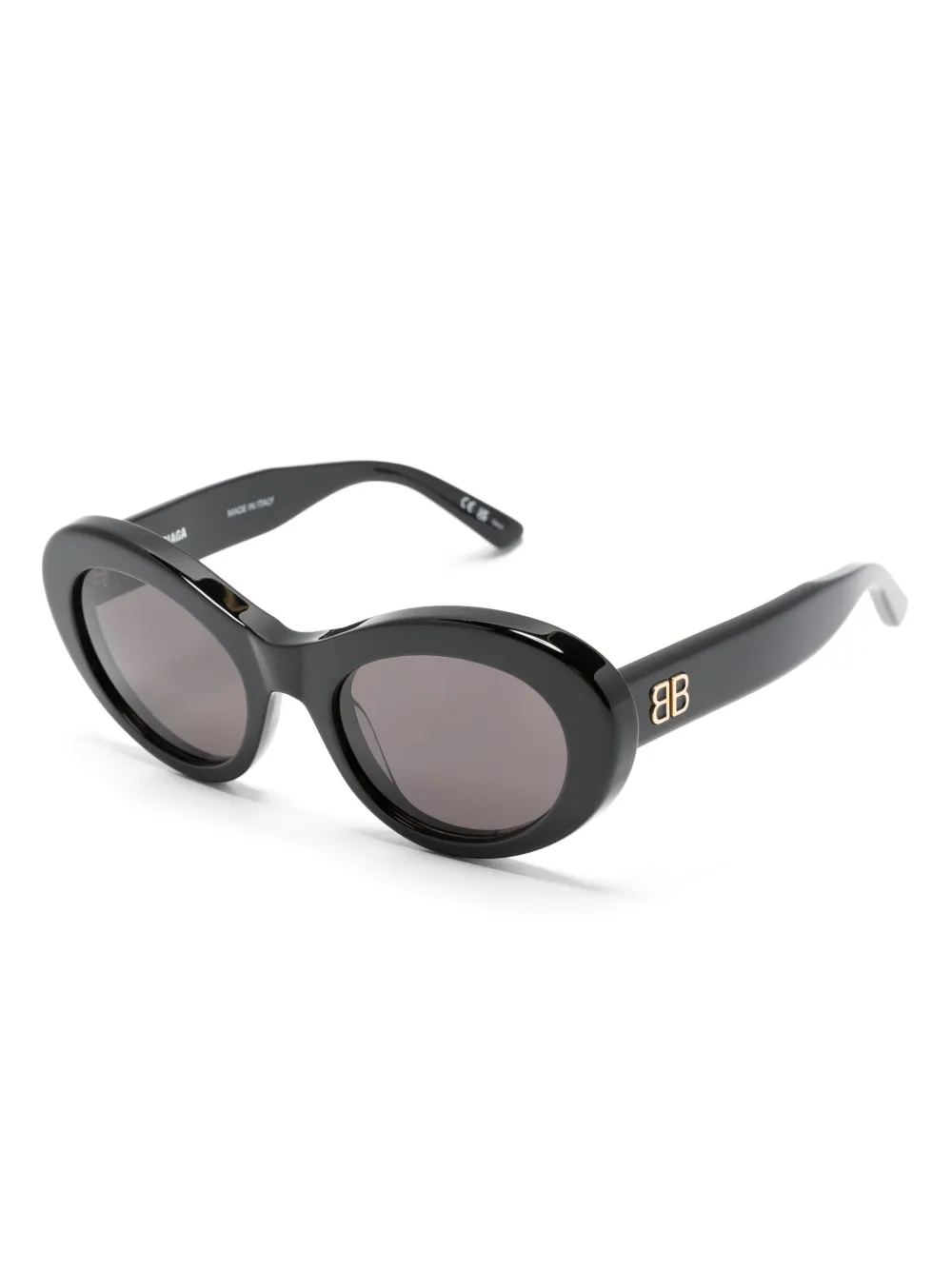 Zwart, acetaat, grijze glazen, rond montuur, logoplakkaat op het pootje, rechte pootjes en gebogen uiteinde. Deze bril wordt verkocht met een beschermhoes..