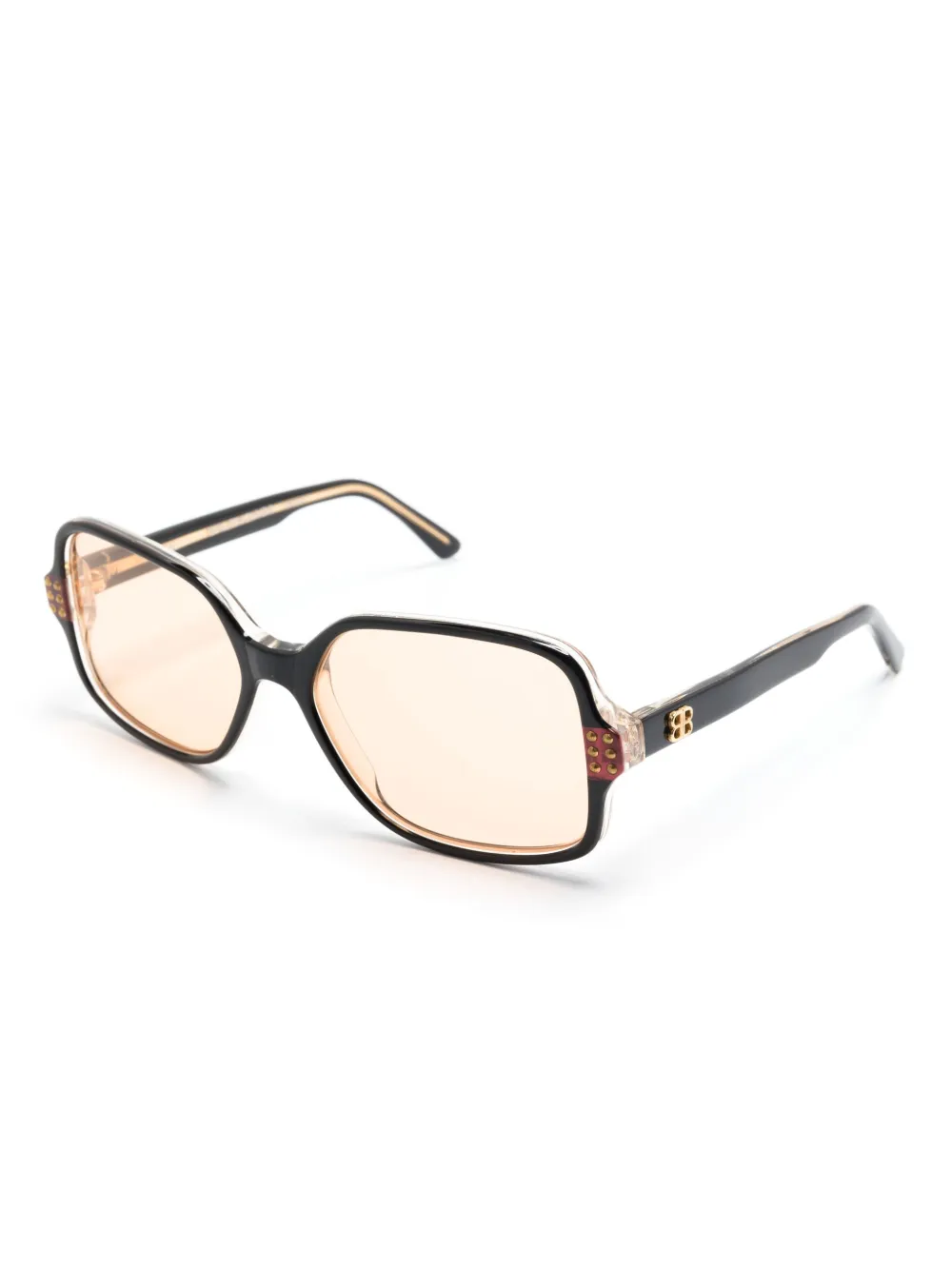 zwart acetaat rechthoekig montuur oranje getinte glazen met UV-bescherming logoplakkaat op het pootje rechte pootjes gebogen uiteinden