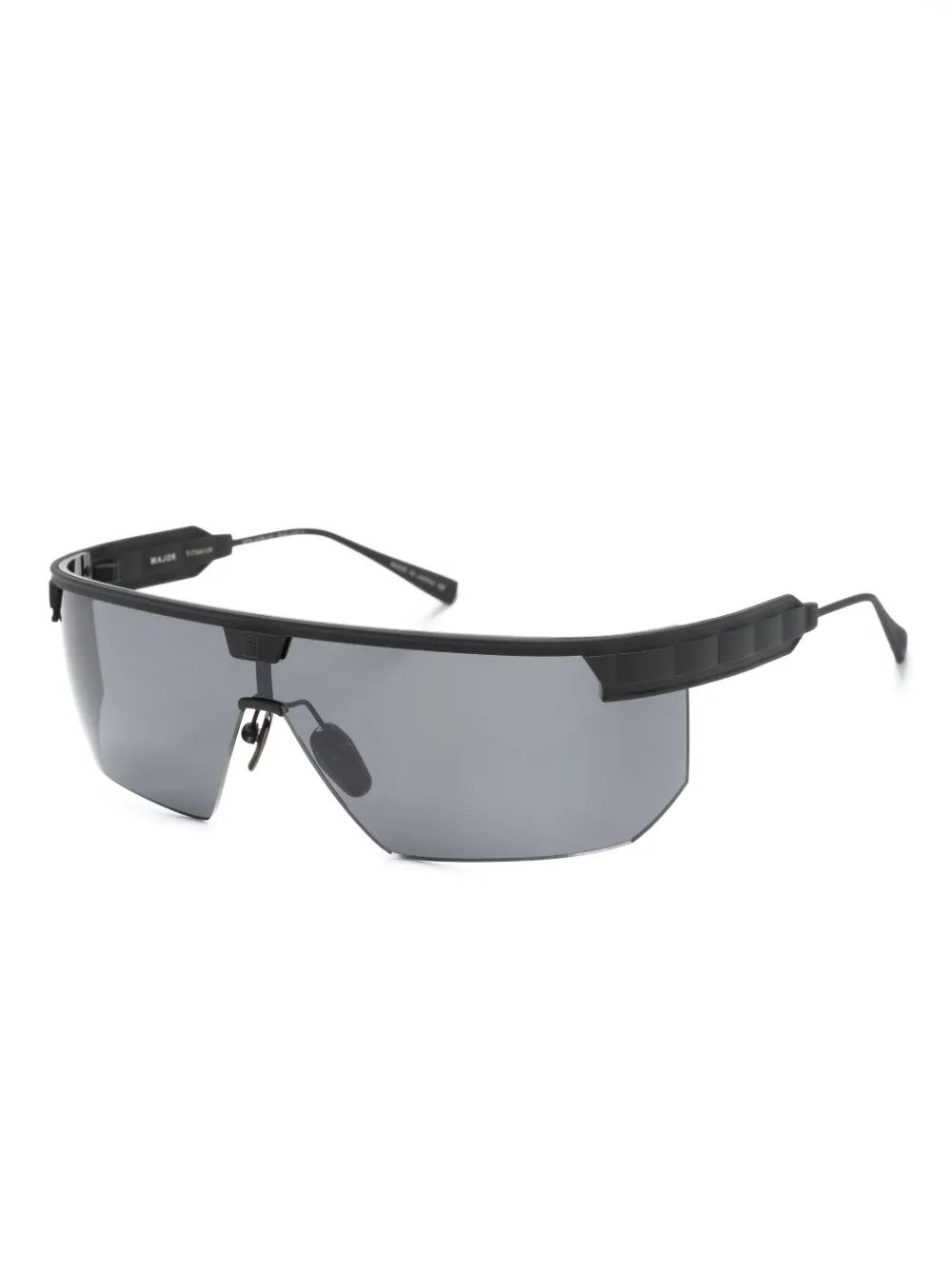 zwart titanium rechthoekig montuur grijze glazen gegraveerd logo neuskussentjes detail met verschillende vlakken rechte pootjes gebogen uiteinde Deze bril wordt verkocht met een beschermhoes.