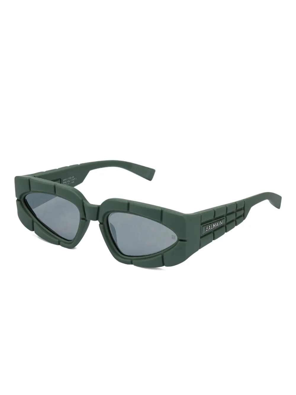donkergroen hoekig design gekleurde glazen logo detail chunky tempel montuur