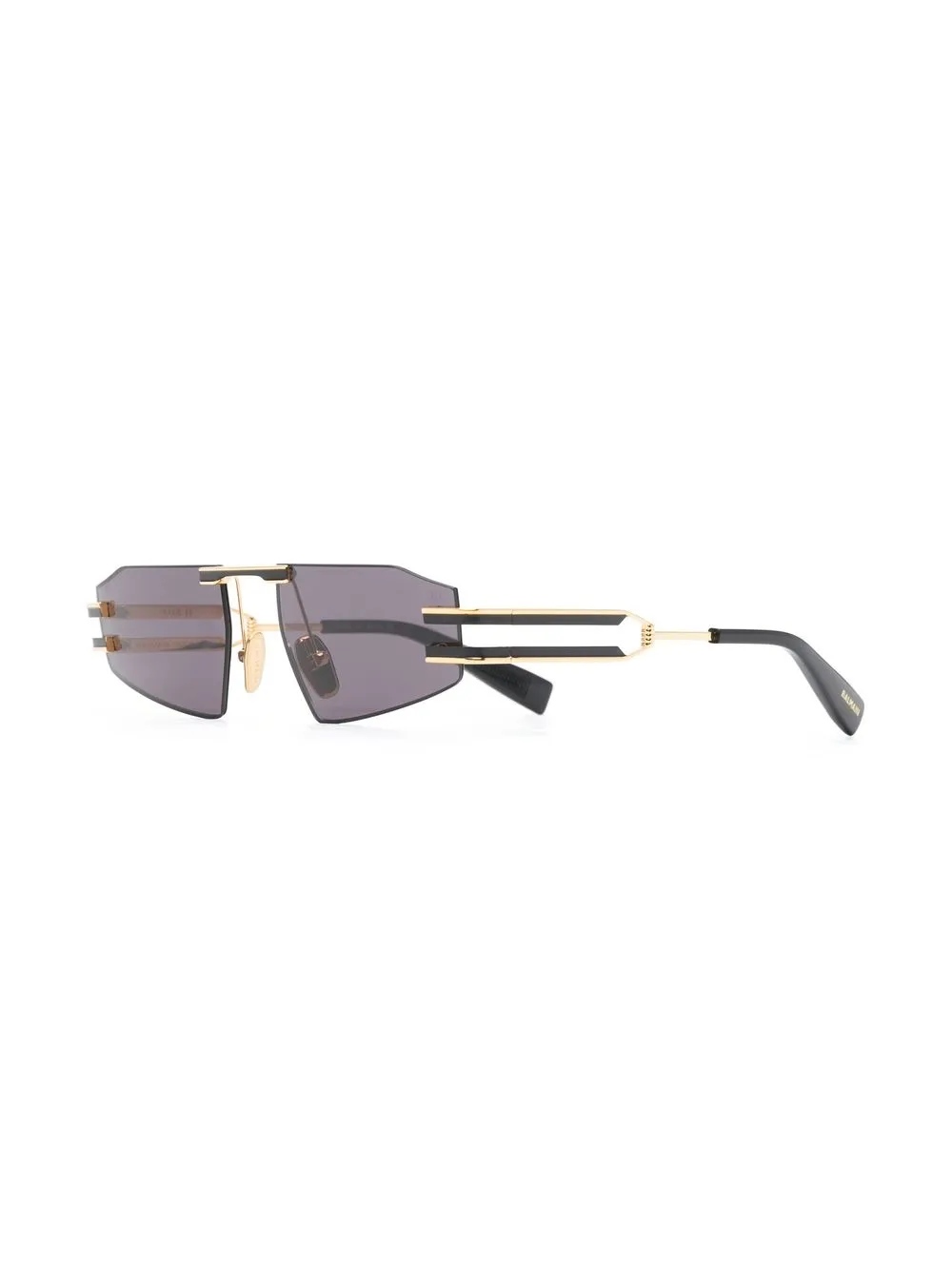 Geometrisch montuur, grijze glazen, goudkleurig materiaal, neuskussentjes, rechte pootjes, gebogen uiteinde en glazen met UV-bescherming. Deze bril wordt verkocht met een beschermhoes..