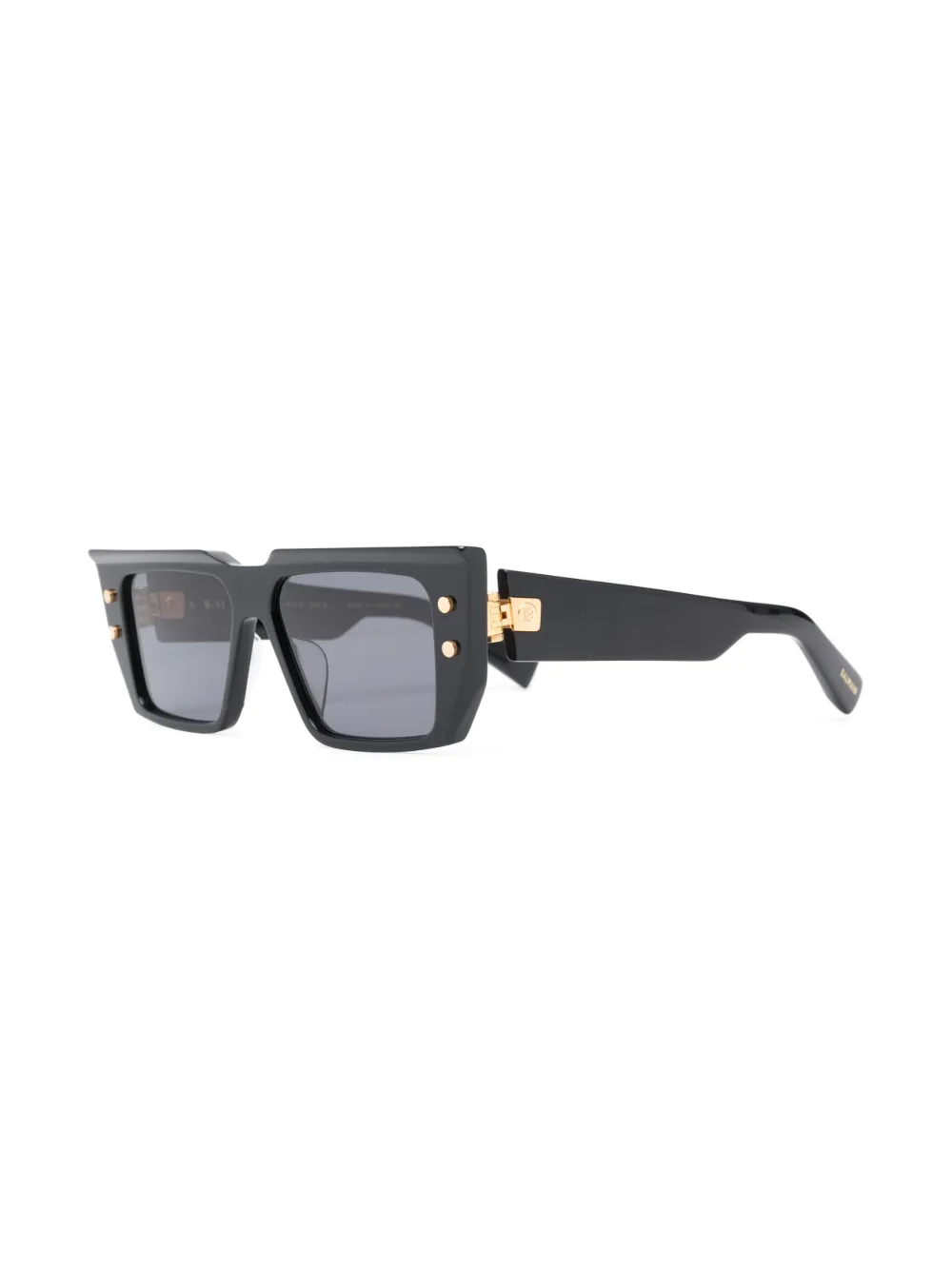 Zwart, acetaat, vierkant montuur, gekleurde glazen, goudkleurig materiaal, logoplakkaat op het pootje, goudkleurig logo, rechte pootjes en gebogen uiteinde. Deze bril wordt verkocht met een beschermhoes..