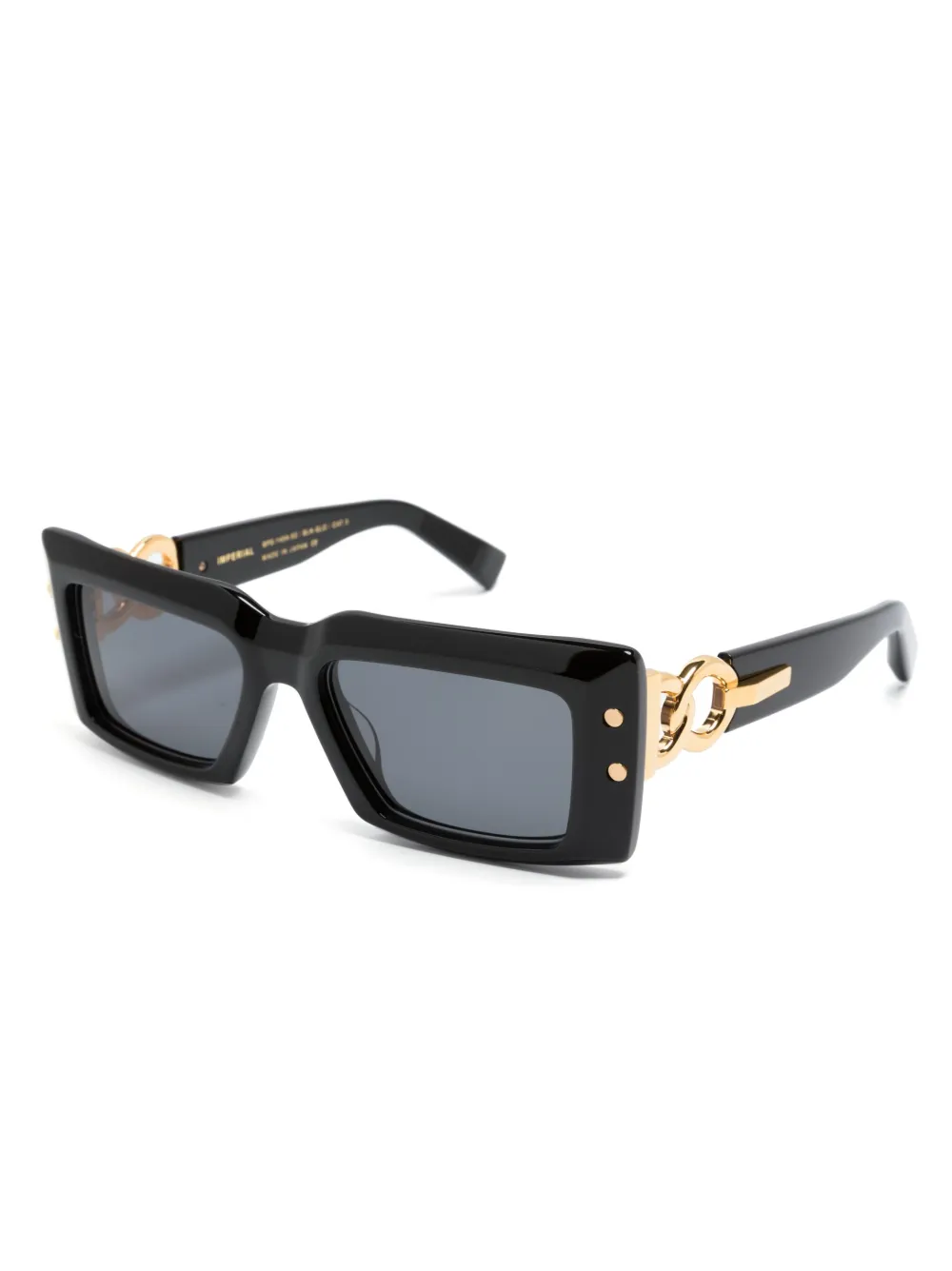 Zwart, acetaat, grijze glazen, vierkant montuur, goudkleurig materiaal, rechte pootjes en gebogen uiteinde. Deze bril wordt verkocht met een beschermhoes..