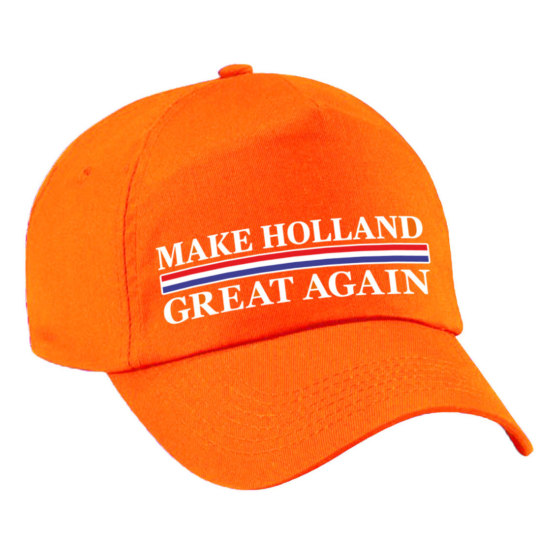 Met deze knallende oranje feestpet ben jij helemaal klaar om Koningsdag groots te maken! De speelse tekst “Make Holland Great Again” laat zien dat jij er vol voor gaat. Of je nu op de vrijmarkt rondsnuffelt, de kroeg onveilig maakt of meedeint met de muziek, deze pet maakt jouw outfit compleet. Dankzij de verstelbare pasvorm zit hij altijd comfortabel, zodat jij zorgeloos kunt feesten.