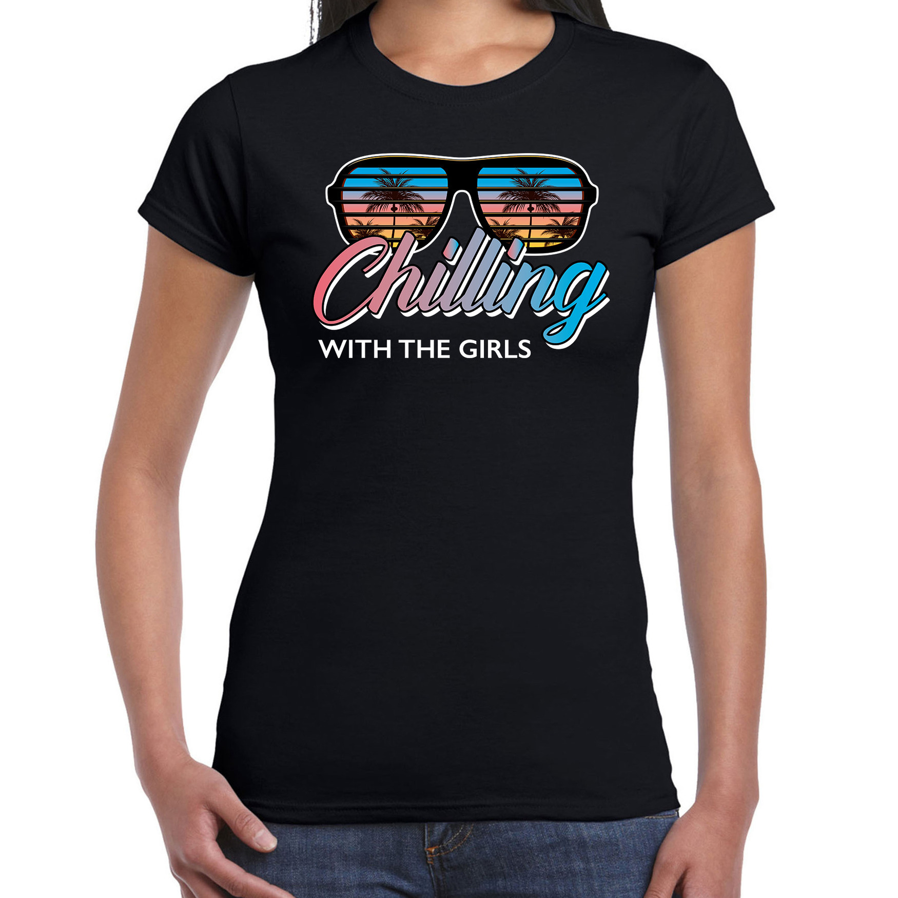 Beach feest t-shirt / kleding Chilling with the girls zwart voor dames. Dit zonnige shirt is bedrukt met een zonnebril met in de glazen kleurrijke lucht met palmen en de tekst: Chilling with the girls.