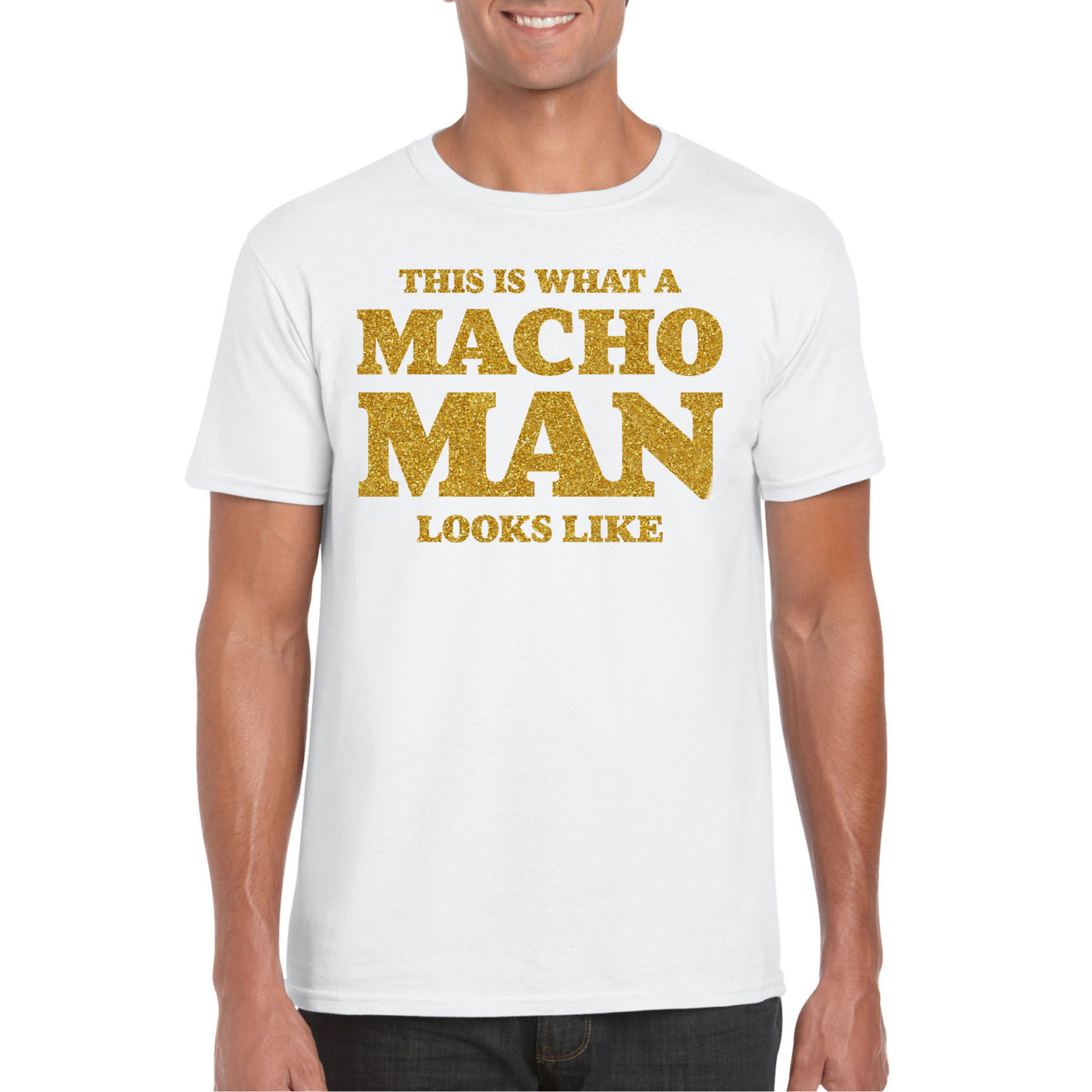 Foute party t-shirt voor heren in de kleur wit met glitterbedrukking in de kleur goud. Het t-shirt is bedrukt met de tekst: This is What A Macho Man Looks Like. Ga jij binnenkort naar een foute party, carnaval of themafeestje? Dan is dit grappige t-shirt onmisbaar! Tevens is hij ook leuk om zomaar te dragen of tijdens het uitgaan/stappen. Materiaal: 145 grams, 100% katoen. Merk: Bellatio Decorations.
