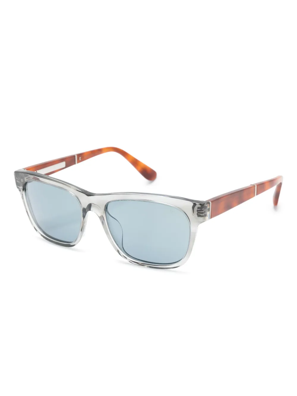 lichtgrijs acetaat doorzichtig design schildpadschild-effect lens sticker pootjes met gegraveerd logo Wayfarer montuur blauw getinte glazen met UV-bescherming neuskussentjes rechte pootjes gebogen uiteinden Deze bril wordt verkocht met een beschermhoes.