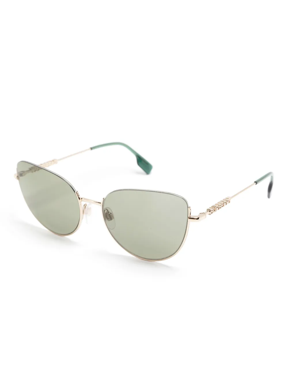 Goudkleurig, metaal, gegraveerd logo, piloten montuur, groengetinte glazen, neuskussentjes, rechte pootjes en gebogen uiteinde. Deze bril wordt verkocht met een beschermhoes..