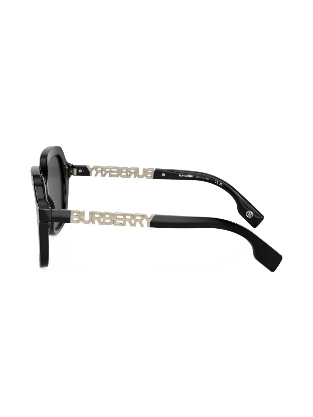 Zwart, acetaat, grijze glazen, oversized montuur, logo, rechte pootjes en gebogen uiteinde. Deze bril wordt verkocht met een beschermhoes..