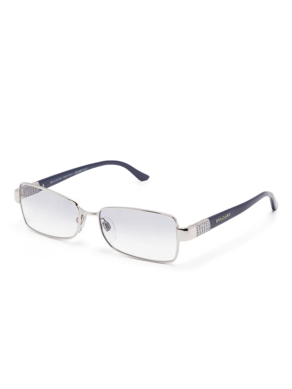 zilverkleurig rechthoekig montuur glazen met kleurverloop rechte pootjes verfraaid met kristallen pootjes met gegraveerd logo gebogen uiteinden logoplakkaat neuskussentjes Deze bril wordt verkocht met een beschermhoes.