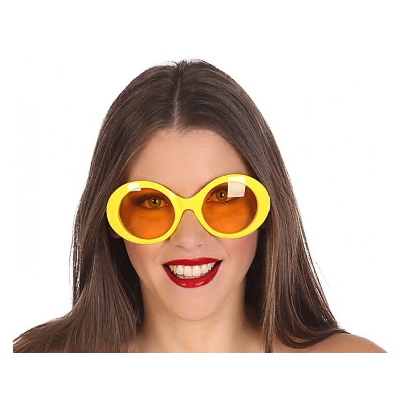 Ronde carnaval verkleed bril of zonnebril met getinte glazen in de kleur Geel. Een echte dames bril. Maak uw verkleedkleding outfit compleet met deze grote zonnebril. O.a. goed voor thema’s zoals: Seventies, Sixties, Hippie, Festival, Fantasy en meer. Let op: dit is een verkleedaccessoire voor volwassenen, beschermt niet tegen de zon en is niet geschikt voor kinderen.