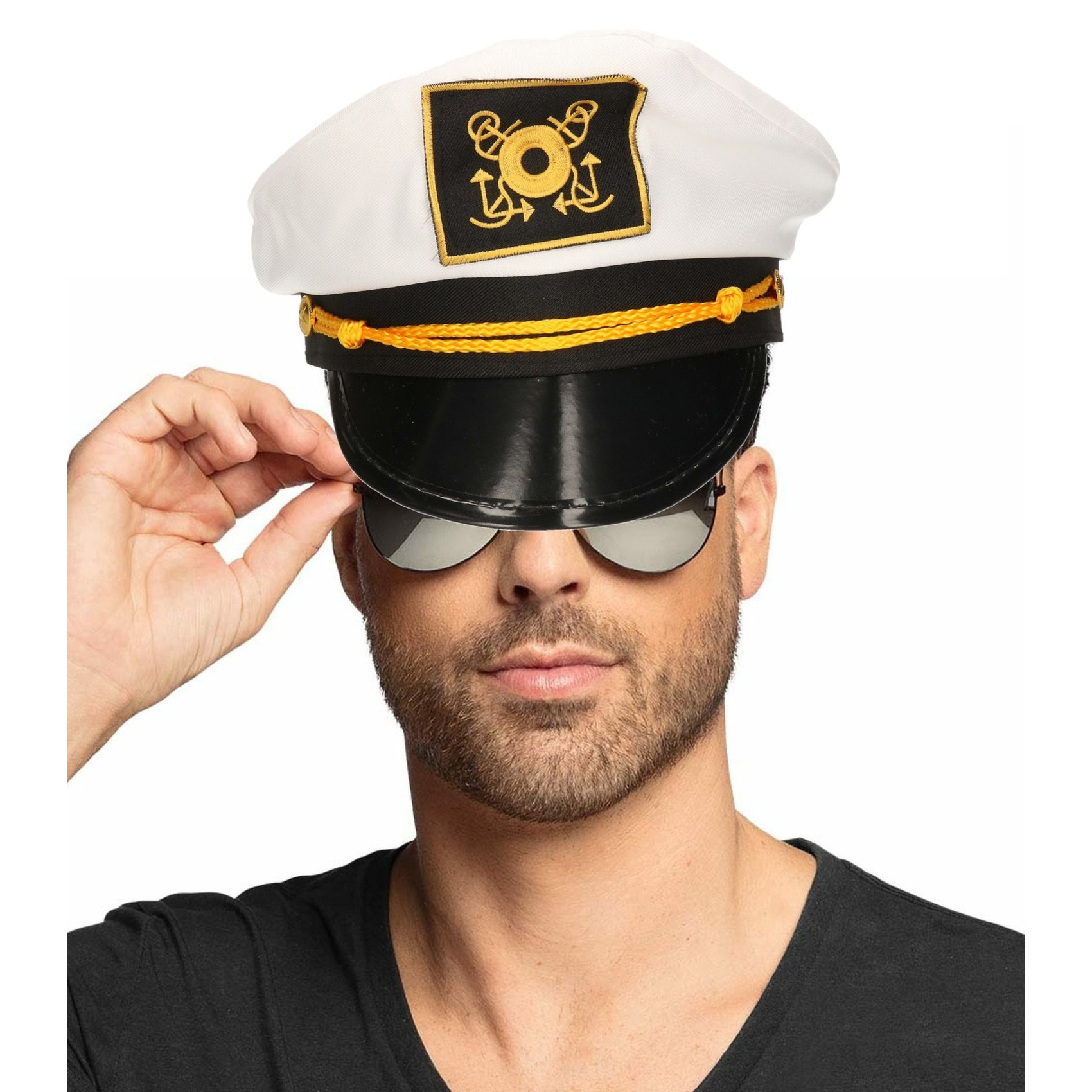 Carnaval verkleed Kapiteinpet met bijpassende zonnebril in de kleur wit. Voor heren en dames. De bril heeft donkereglazen. Verkleedkleding kostuums accessoires. Thema: Kapitein, Maritiem, Marine.