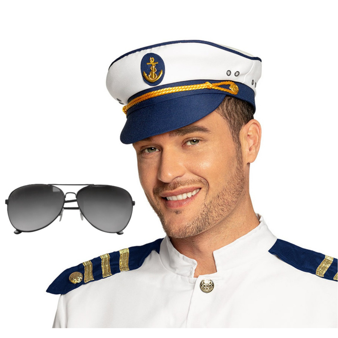 Carnaval verkleed Kapiteinpet met bijpassende zonnebril in de kleur wit. Voor heren en dames. De bril heeft spiegel glazen. Verkleedkleding kostuums accessoires. Thema: Kapitein, Maritiem, Marine.