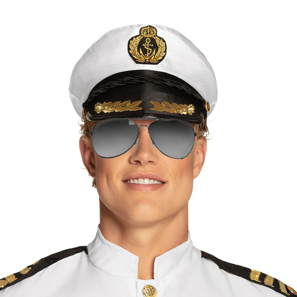 Carnaval verkleed Kapiteinpet met bijpassende zonnebril in de kleur wit. Voor heren en dames. De bril heeft spiegel glazen. Verkleedkleding kostuums accessoires. Thema: Kapitein, Maritiem, Marine.