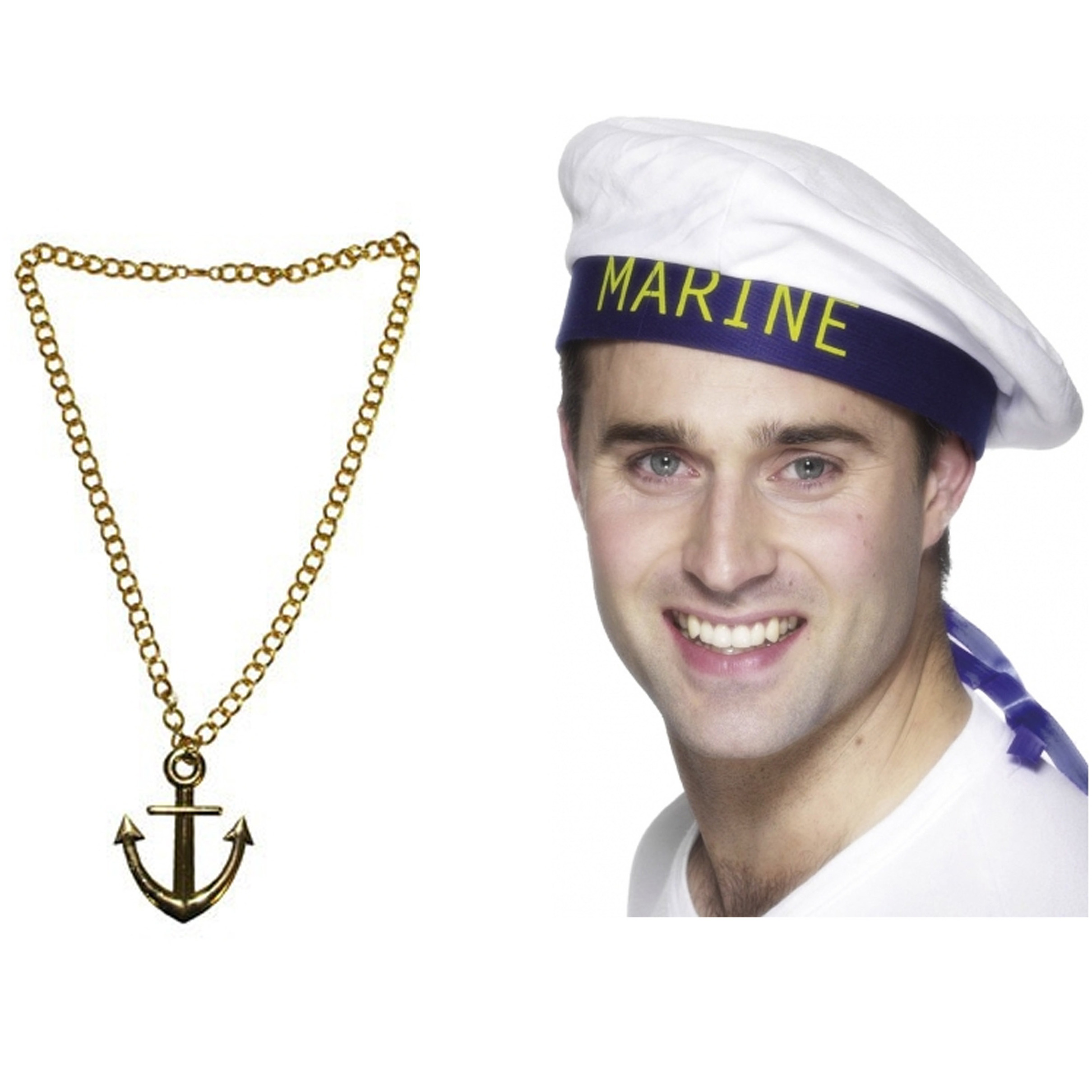 Carnaval verkleed matrozen hoedje in de kleur wit en bijpassende gouden ketting met een anker. Voor heren en dames. De ketting is van kunststof. Verkleedkleding kostuums accessoires. Thema: Matroos, Maritiem, Marine, Boten.