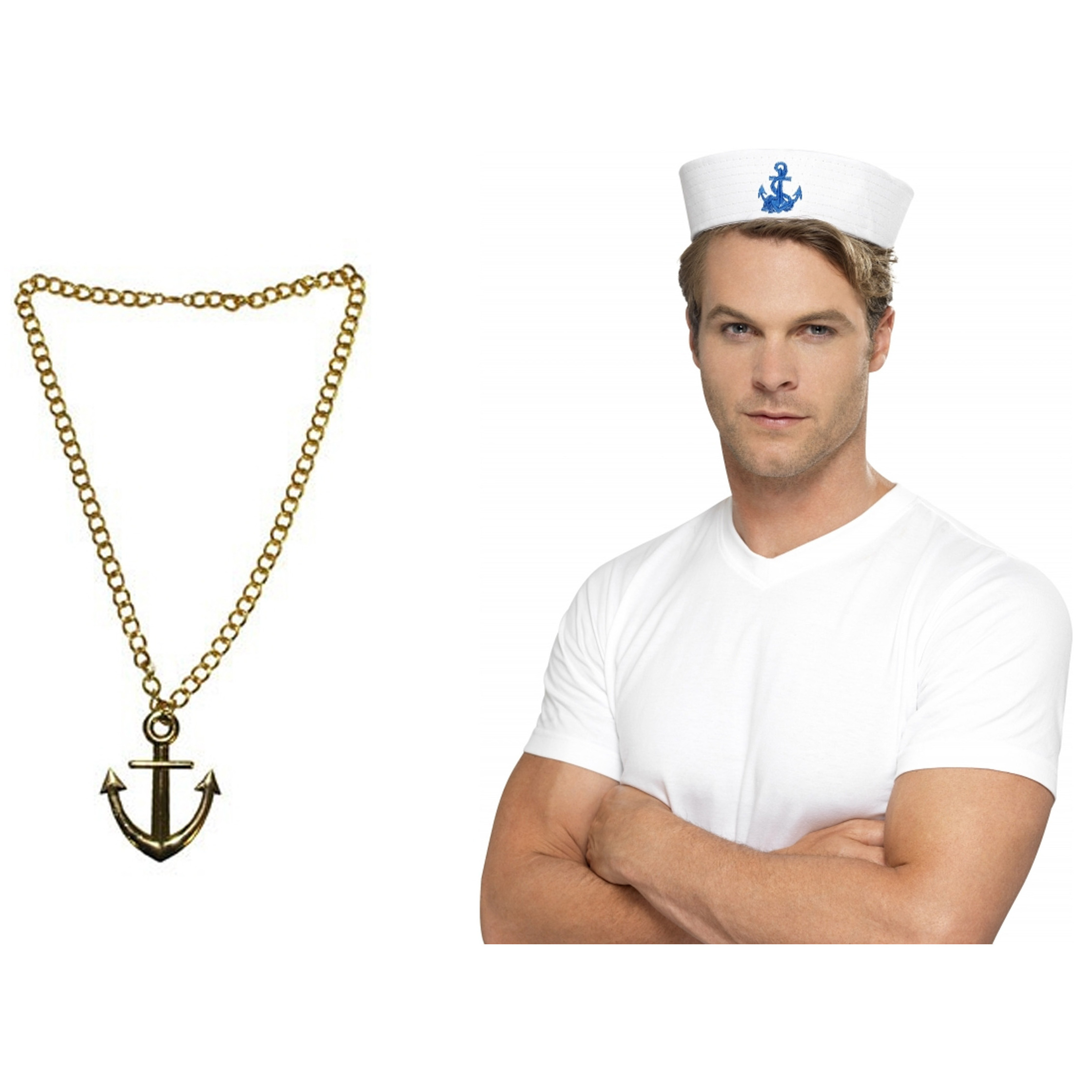 Carnaval verkleed matrozen hoedje in de kleur wit en bijpassende gouden ketting met een anker. Voor heren en dames. De ketting is van kunststof. Verkleedkleding kostuums accessoires. Thema: Matroos, Maritiem, Marine, Boten.