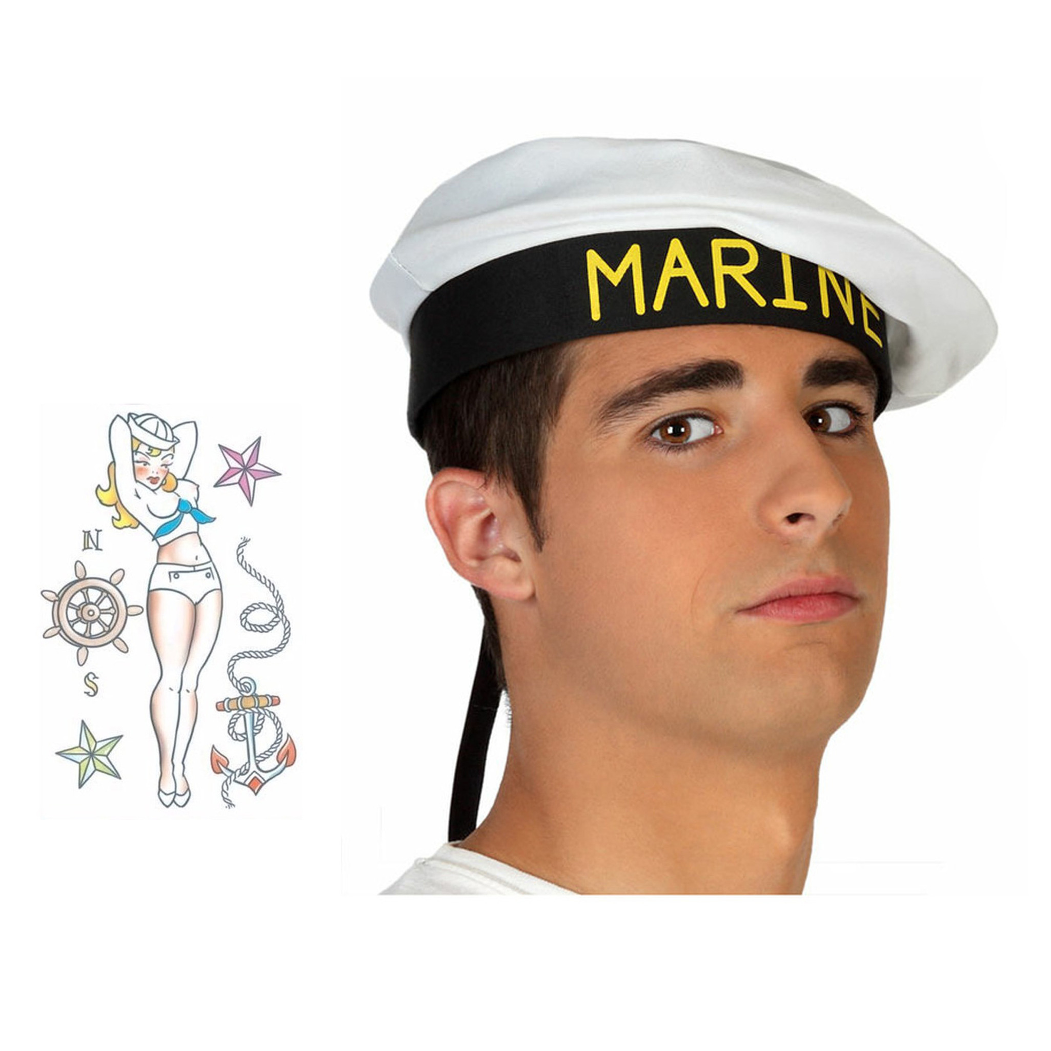 Carnaval verkleed scheeps matrozen hoedje in de kleur wit en bijpassende zeemannen tatoeages. Voor heren en dames. De tattoo’s kunt u op doen door ze nat te maken, op te plakken en 30 seconden te laten rusten. Tattoos van een anker, stuurwiel en een lekkere chick. Verkleedkleding kostuums accessoires. Thema: Matroos, Maritiem, Marine, Boten, Zeemannen.