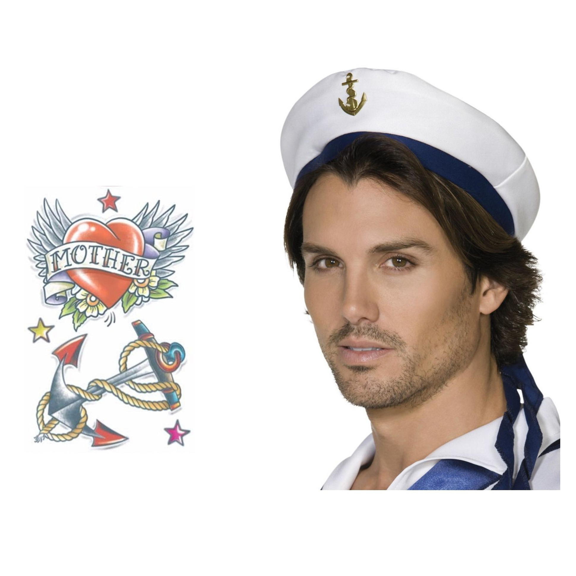 Carnaval verkleed scheeps matrozen hoedje in de kleur wit en bijpassende zeemannen tatoeages. Voor heren en dames. De tattoo’s kunt u op doen door ze nat te maken, op te plakken en 30 seconden te laten rusten. Tattoos van een anker en mother/love. Verkleedkleding kostuums accessoires. Thema: Matroos, Maritiem, Marine, Boten, Zeemannen.