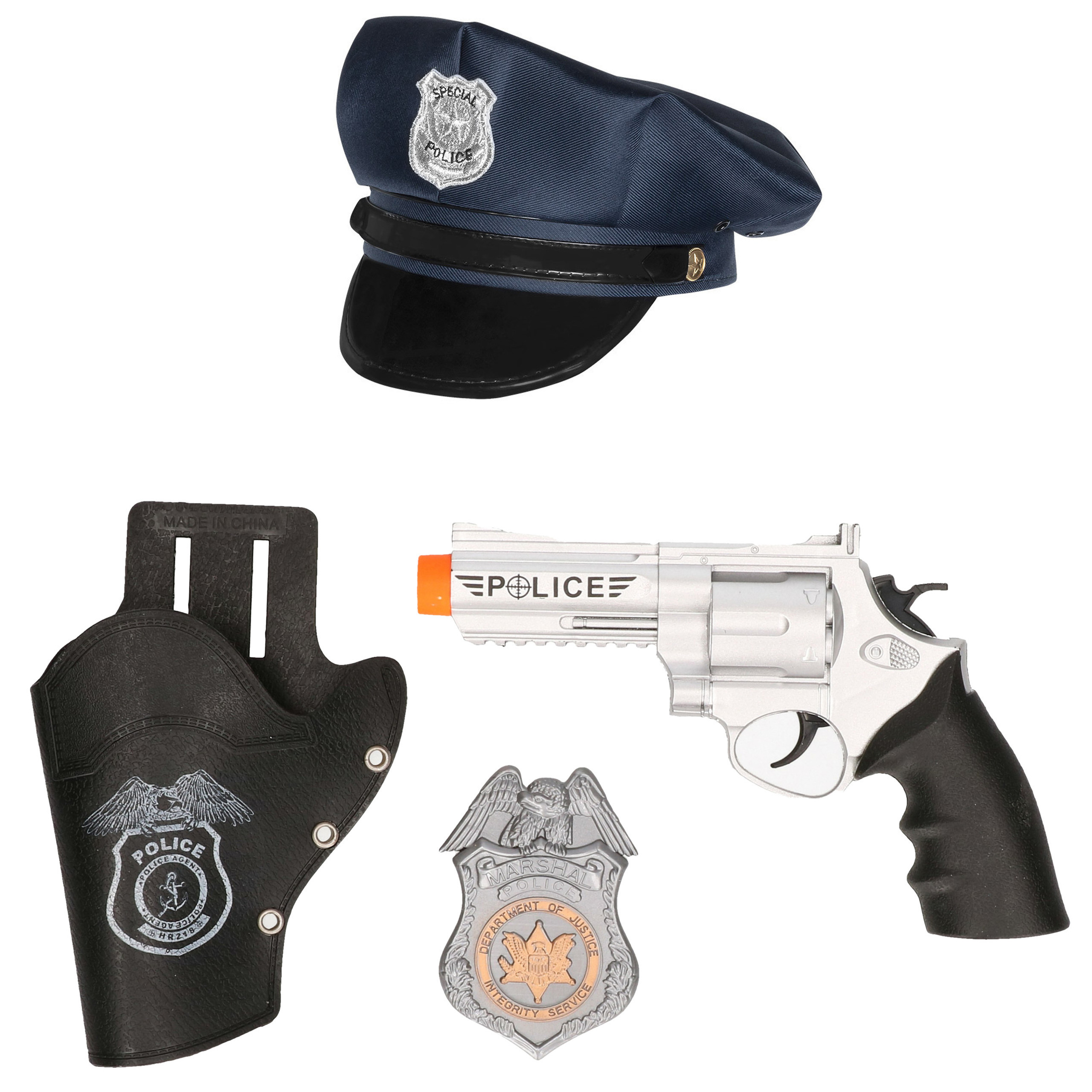, Dit artikel bestaat uit:, 1x Carnaval verkleed speelgoed set – pistool/holster van kunststof – Politie thema, 1x Carnaval verkleed Politie agent hoedje – blauw/zilver – voor kinderen – Politie thema