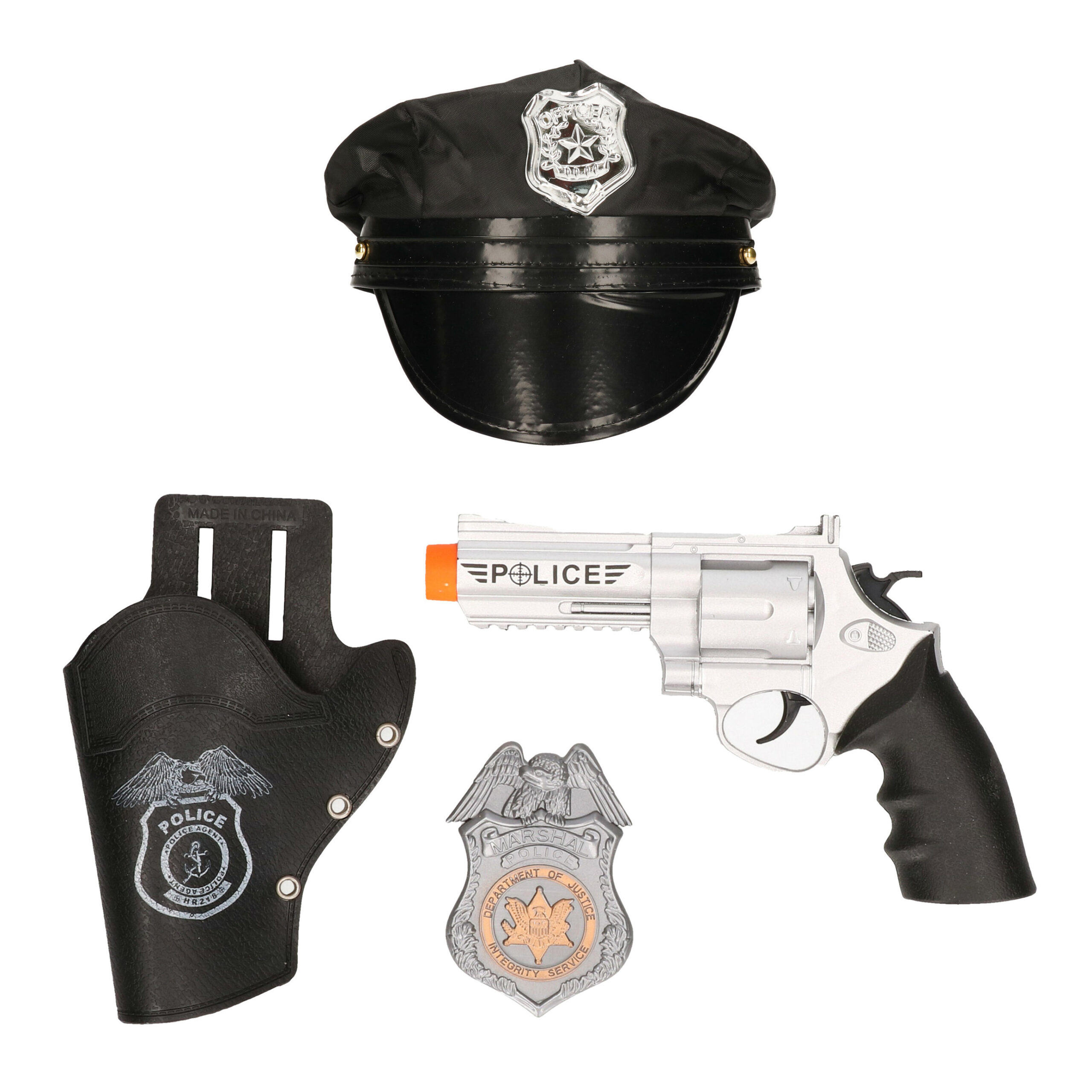 Carnaval verkleed set, bestaande uit een politie agenten pet/cap in de kleur zwart en een pistool/holster en politie badge. Geschikt voor kinderen. Verkleedkleding kostuums accessoires. Thema: Politie agenten.