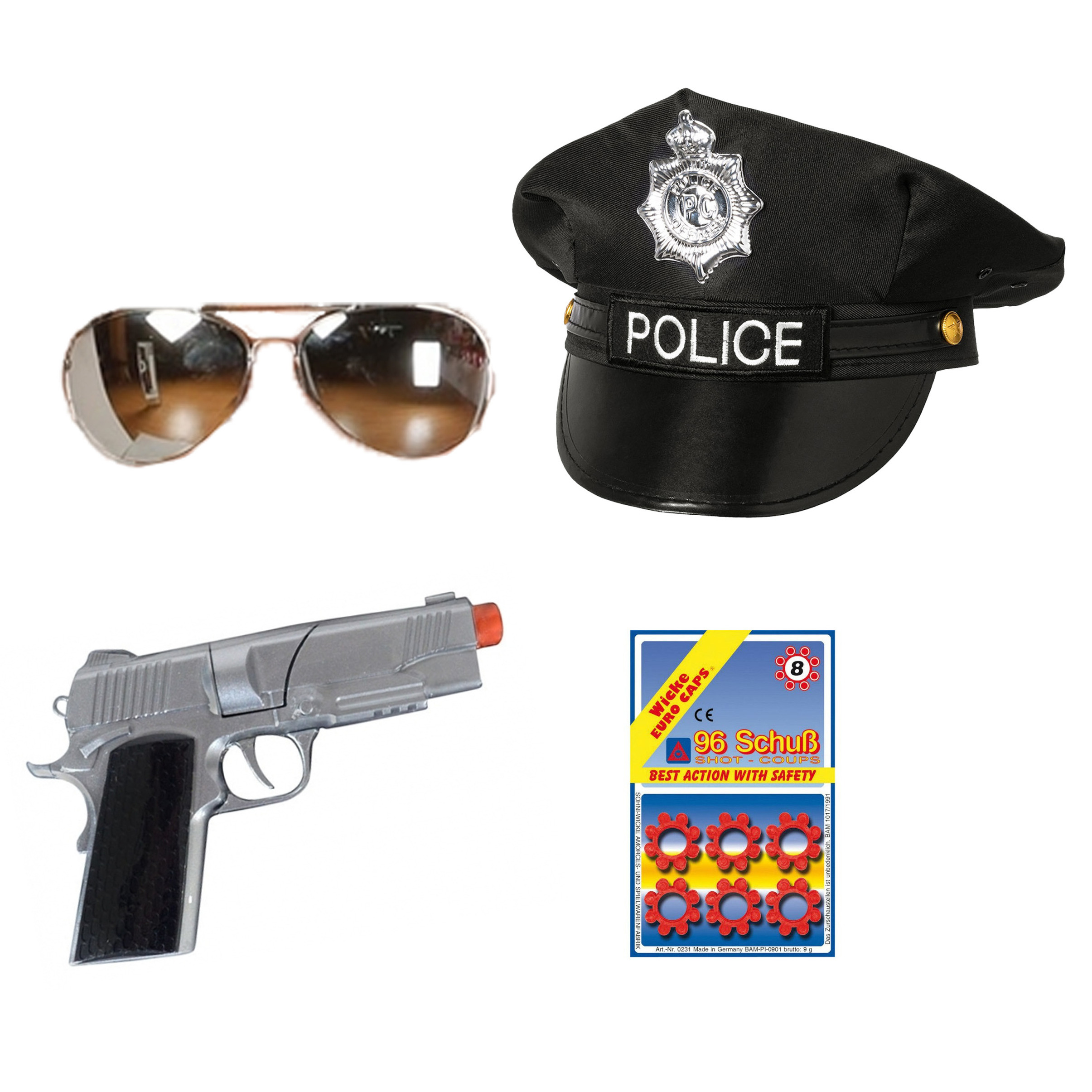 Carnaval verkleed setje XL, bestaande uit een politie agent pet in de kleur zwart, een spiegel zonnebril en een speelgoed pistool 8-shots met 96x plaffertjes. Geschikt voor heren en dames. Verkleedkleding kostuums accessoires. Thema: Politie agenten. De revolver/pistool knalt echt.