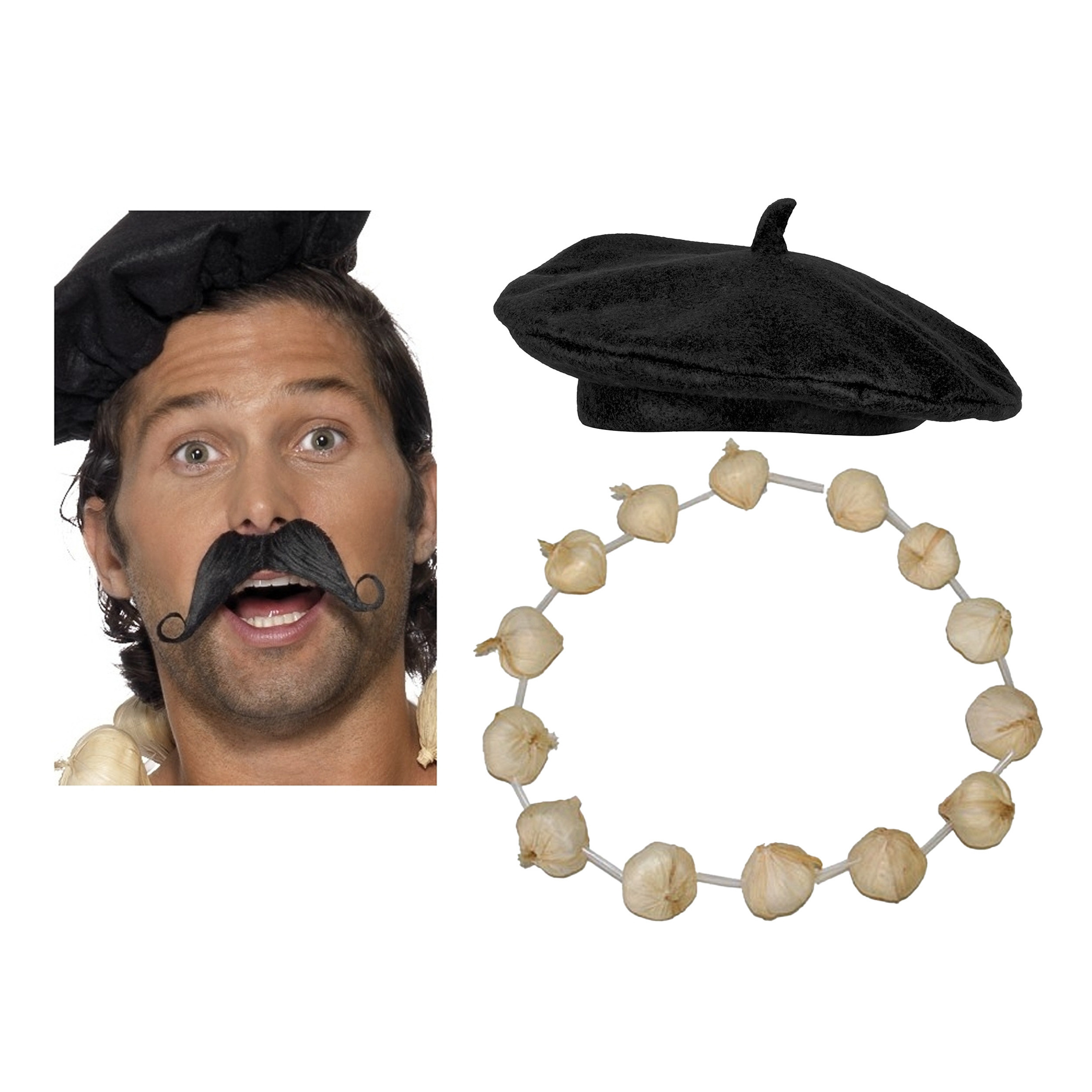 Carnaval compleet verkleed setje voor een Fransman bestaande uit een baret in het zwart, een Franse plaksnor in de kleur zwart en een knoflook ketting. Voor volwassenen, heren. Meteen verkleed zijn met deze thema verkleedset in een specefiek thema. Verkleedkleding kostuums accessoires. Themas: Frankrijk, Landen, Supporter, Fransman, Allo Allo. , Dit artikel bestaat uit:, 1x Knoflook ketting – Carnaval verkleed spullen Fransman/Dracula thema, 1x Fransman verkleed nepsnor/plaksnor – zwarte krulsnor – volwassenen, 1x Carnaval verkleed hoed – Franse Baret – dames/heren – zwart – polyester