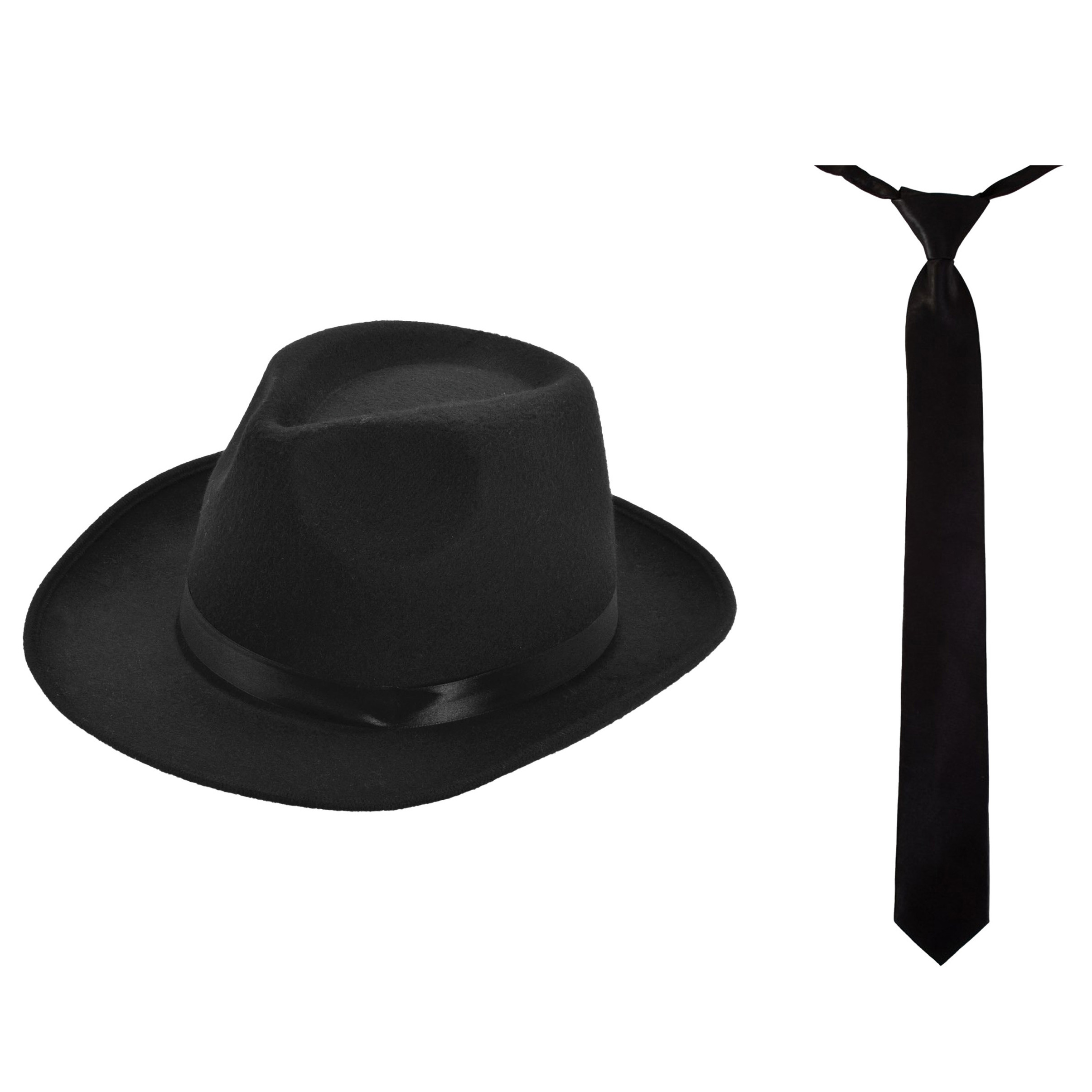 Carnaval compleet verkleed setje bestaande uit een gangster/maffia hoedje en een nette stropdas in de kleur zwart. Voor volwassenen, dames en heren. Meteen verkleed zijn met deze thema verkleedset in een uni kleur. Verkleedkleding kostuums accessoires. Themas: Gangster, Maffia, Glitter and Glamour, VIP, Jaren 20, Roaring Twenties. , Dit artikel bestaat uit:, 1x Zwarte Fedora verkleed hoed – volwassenen – Halloween Freddy Krueger, – Al Capone – Gangsters, 1x Carnaval verkleed stropdas – zwart – polyester – heren/dames – Gangster/rock and roll/blues brothers
