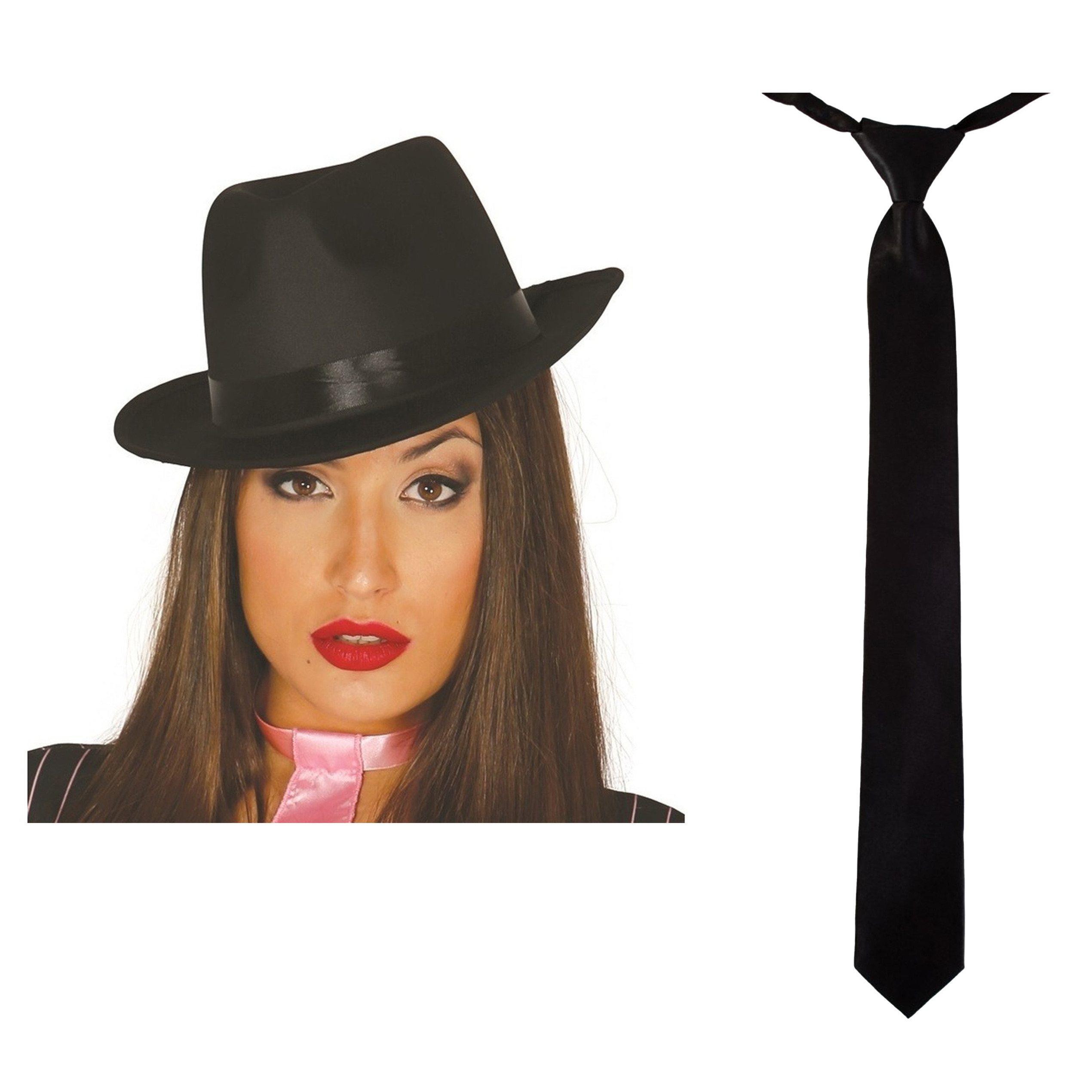 Carnaval compleet verkleed setje bestaande uit een gangster/maffia hoedje en een nette stropdas in de kleur zwart. Voor volwassenen, dames en heren. Meteen verkleed zijn met deze thema verkleedset in een uni kleur. Verkleedkleding kostuums accessoires. Themas: Gangster, Maffia, Glitter and Glamour, VIP, Jaren 20, Roaring Twenties. , Dit artikel bestaat uit:, 1x Luxe zwarte gangster/maffia trilby gleufhoed voor volwassenen, 1x Carnaval verkleed stropdas – zwart – polyester – heren/dames – Gangster/rock and roll/blues brothers