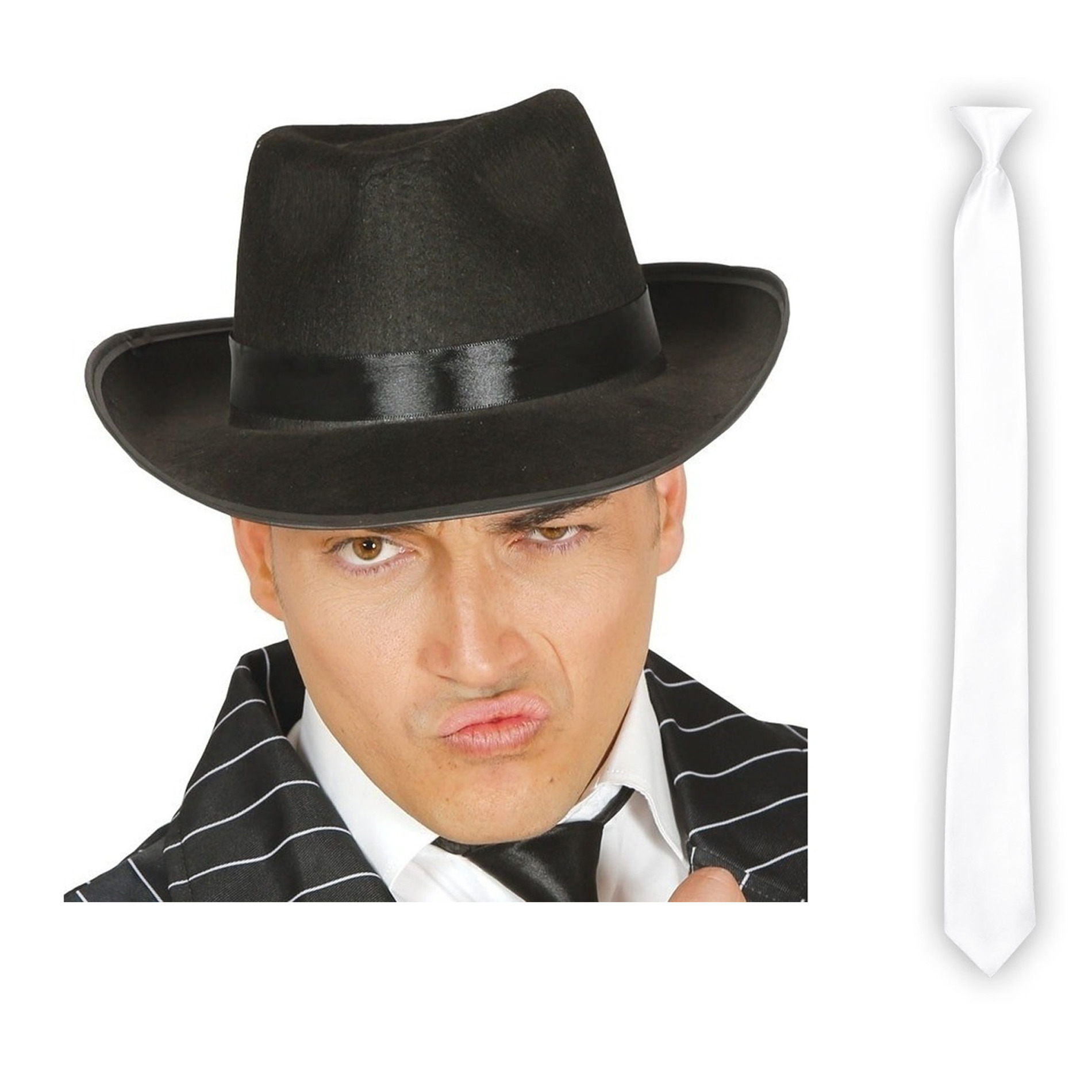 Carnaval compleet verkleed setje bestaande uit een gangster/maffia hoedje in het zwart en een nette stropdas in de kleur wit. Voor volwassenen, dames en heren. Meteen verkleed zijn met deze thema verkleedset in een uni kleur. Verkleedkleding kostuums accessoires. Themas: Gangster, Maffia, Glitter and Glamour, VIP, Jaren 20, Roaring Twenties. , Dit artikel bestaat uit:, 1x Gangster/maffia trilby gleufhoed – zwart – voor volwassenen – verkleedhoed – Carnaval hoeden, 1x Verkleed stropdas – wit – 50 cm – breed 6 cm – Voor volwassenen – Carnaval