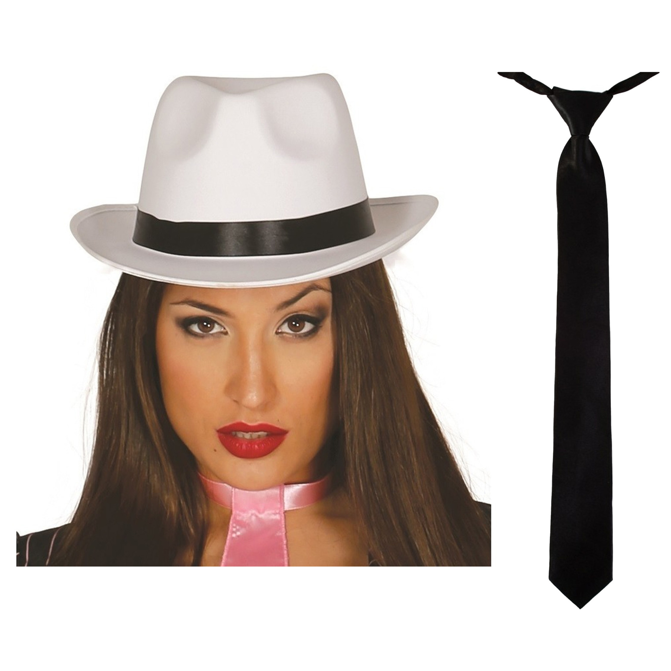 Carnaval compleet verkleed setje bestaande uit een gangster/maffia hoedje in het wit en een nette stropdas in de kleur zwart. Voor volwassenen, dames en heren. Meteen verkleed zijn met deze thema verkleedset in een uni kleur. Verkleedkleding kostuums accessoires. Themas: Gangster, Maffia, Glitter and Glamour, VIP, Jaren 20, Roaring Twenties. , Dit artikel bestaat uit:, 1x Carnaval verkleed Gangster stropdas – zwart – polyester, 1x Luxe witte gangster/maffia trilby gleufhoed voor volwassenen