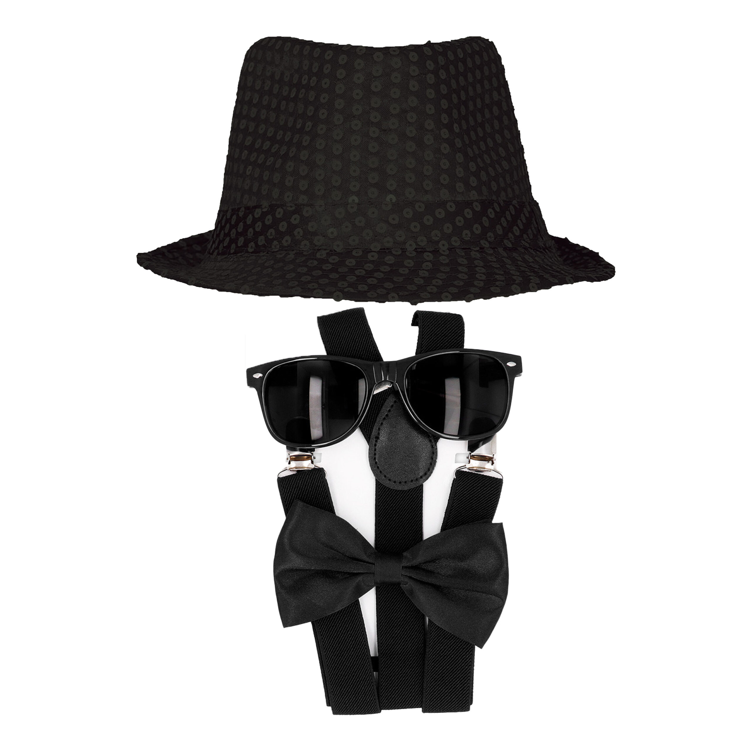 Carnaval compleet verkleed setje bestaande uit een glitter hoedje, een vlinderstrikje, een party zonnebril en een bretels in de kleur zwart. Voor volwassenen, dames en heren. Lekker opvallen met deze thema verkleedset in een uni kleur. Verkleedkleding kostuums accessoires. Themas: Disco, Eighties, Toppers, Glitter and Glamour, VIP. Let op: dit is een verkleedaccessoire voor volwassenen, geen speelgoed. , Dit artikel bestaat uit:, 1x Carnaval verkleed hoedje – glitter zwart – volwassenen/heren – met paillette, 1x Carnaval verkleed set – bretels/party bril/vlinderstrikje – zwart – volwassenen/heren/dames
