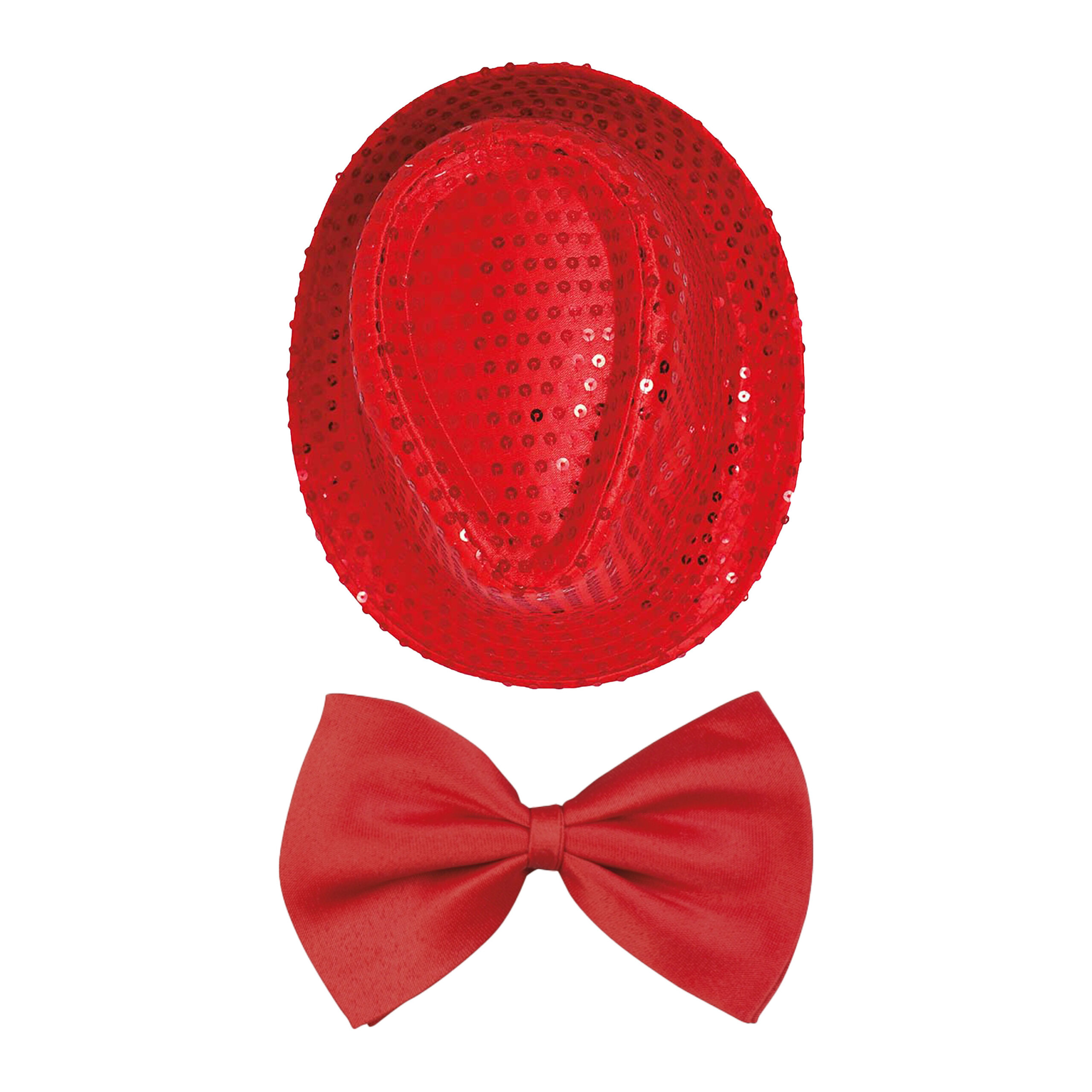 Carnaval compleet verkleed setje bestaande uit een glitter hoedje en een vlinderstrikje in de kleur rood. Voor volwassenen, dames en heren. Lekker opvallen met deze thema verkleedset in een uni kleur. Verkleedkleding kostuums accessoires. Themas: Disco, Eighties, Toppers, Glitter and Glamour, VIP. Let op: dit is een verkleedaccessoire voor volwassenen, geen speelgoed. , Dit artikel bestaat uit:, 1x Vlinderstrikje – rood – polyester – 11 cm – voor dames/heren – verkleedartikelen , 1x Carnaval verkleed hoedje – glitter rood – volwassenen/heren – met paillette