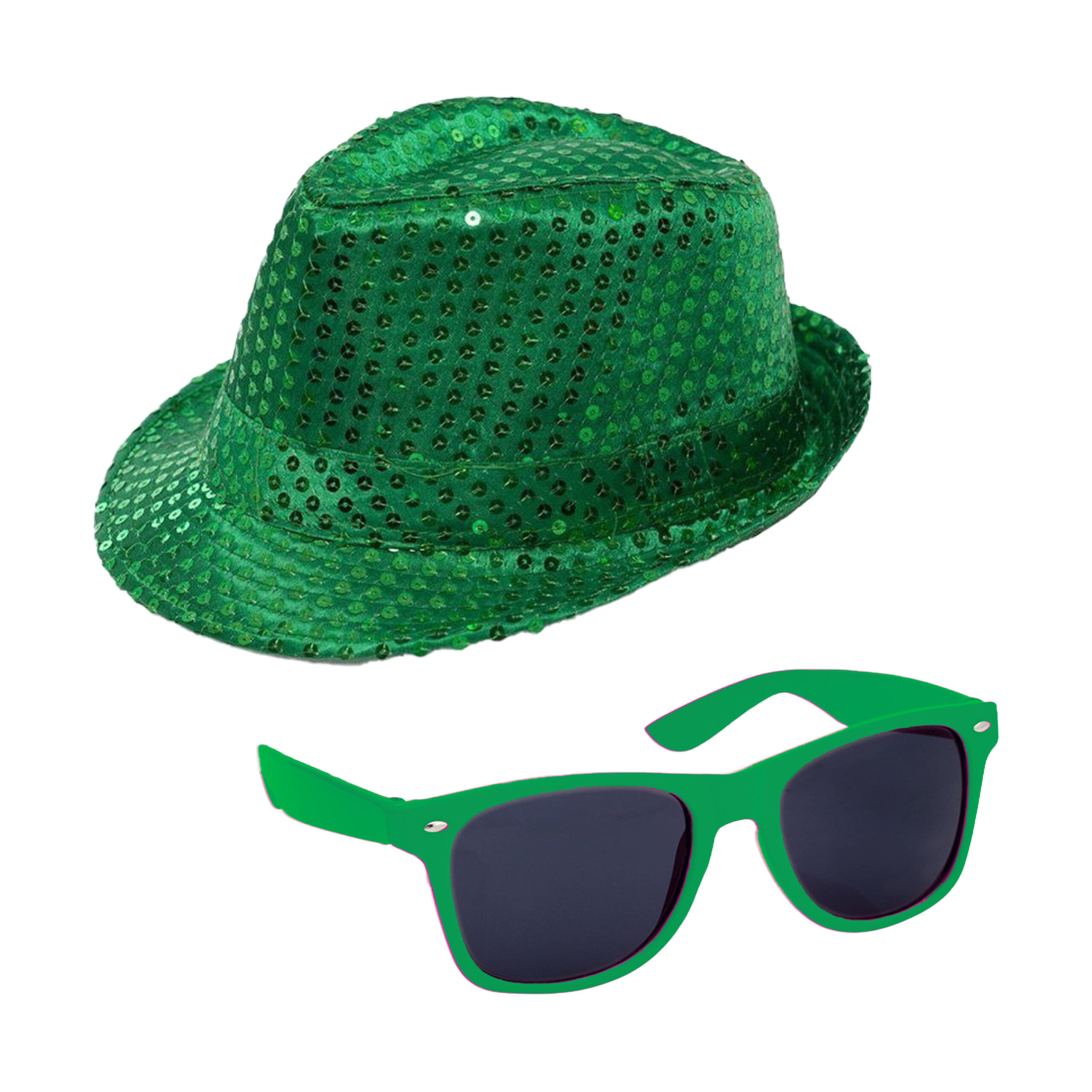 Carnaval compleet verkleed setje bestaande uit een glitter hoedje en een zonnebril in de kleur groen. Voor volwassenen, dames en heren. Lekker opvallen met deze thema verkleedset in een uni kleur. Verkleedkleding kostuums accessoires. Themas: Disco, Eighties, Toppers, Glitter and Glamour, VIP. , Dit artikel bestaat uit:, 1x Party zonnebril – groen – kunststof – UV400 – verkleedbril voor volwassenen, 1x Trilby hoed met pailletten – groen – glitter