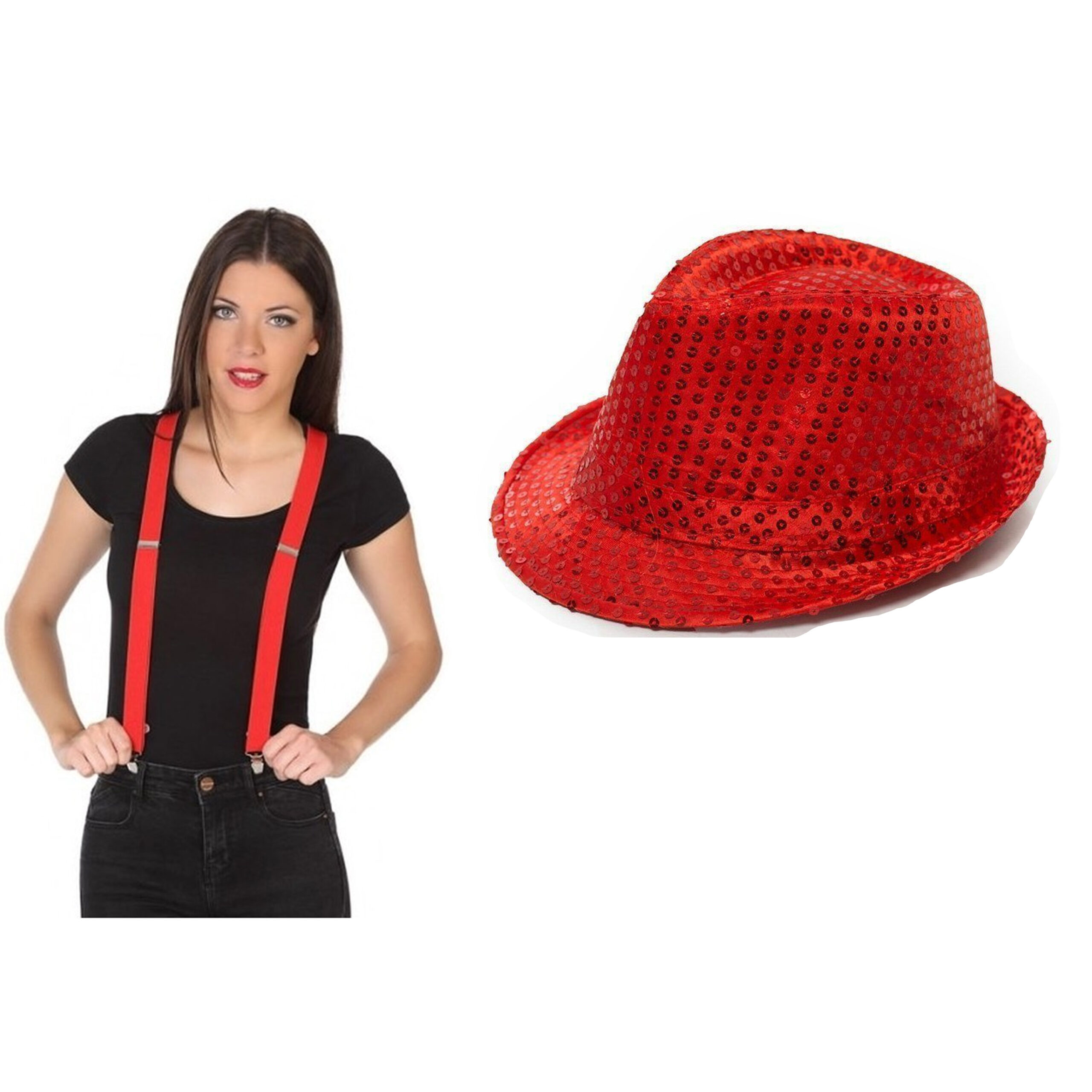 Carnaval verkleed rood kleuren setje met glitter hoed en bretels. Het hoedje heeft pailletten. Voor volwassenen, dames en heren. Lekker opvallen met deze glitters thema verkleedset. Verkleedkleding kostuums accessoires. Themas: Disco, Eighties, Foute party, Toppers. Let op: dit is een verkleedaccessoire voor volwassenen, geen speelgoed. , Dit artikel bestaat uit:, 1x Trilby hoed met pailletten – rood – glitter, 1x Verkleed Bretels voor volwassenen – Rood – Carnaval verkleedaccessoires – verstelbaar